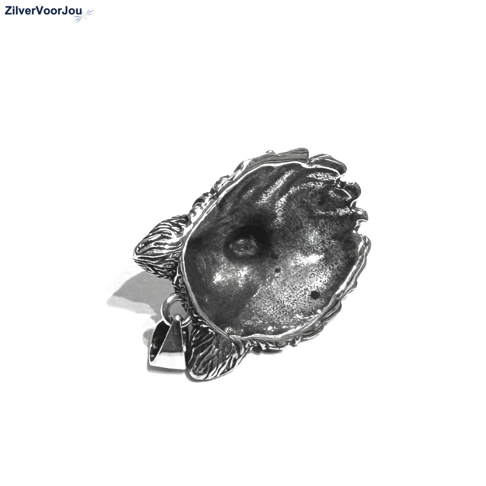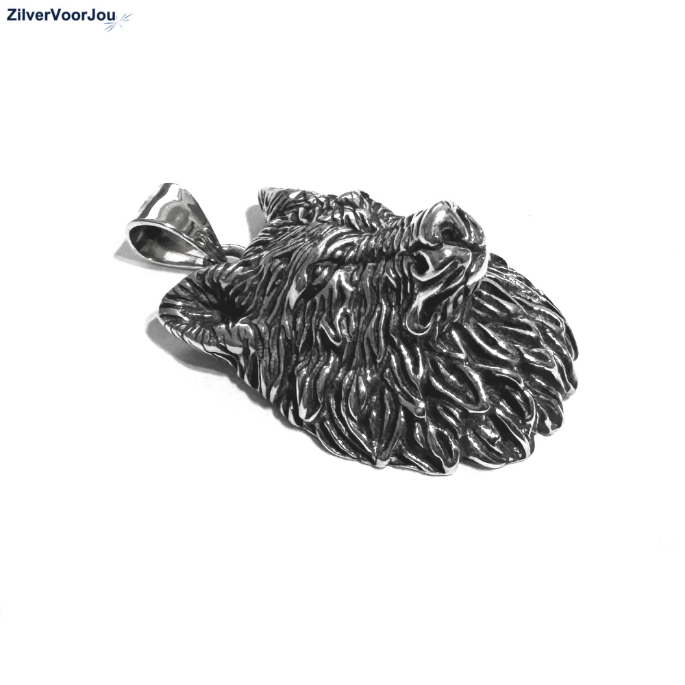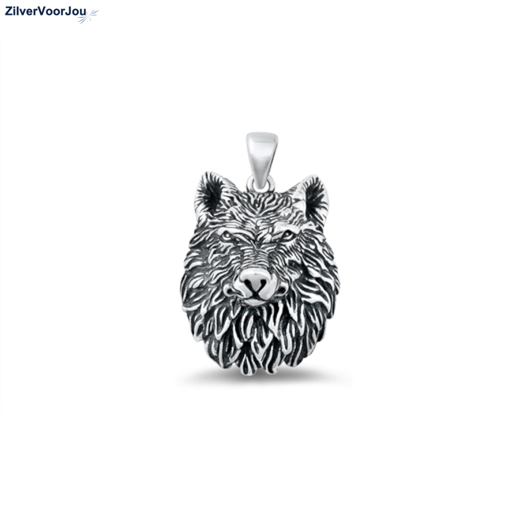 Schitterende wolf, wolvenkop kettinghanger. Mooie 3d hanger! De kop is circa 26 mm lang en 20 mm breed ex oog. Gemaakt van 925 zilver en geoxideerd (iets gezwart).
