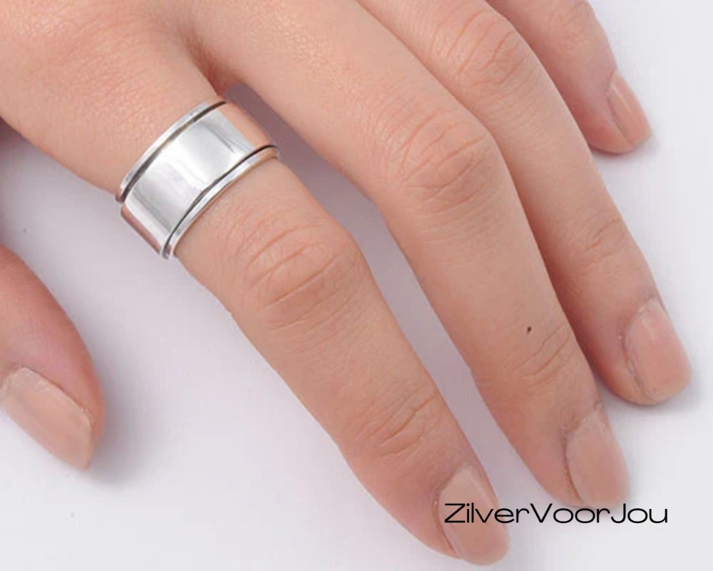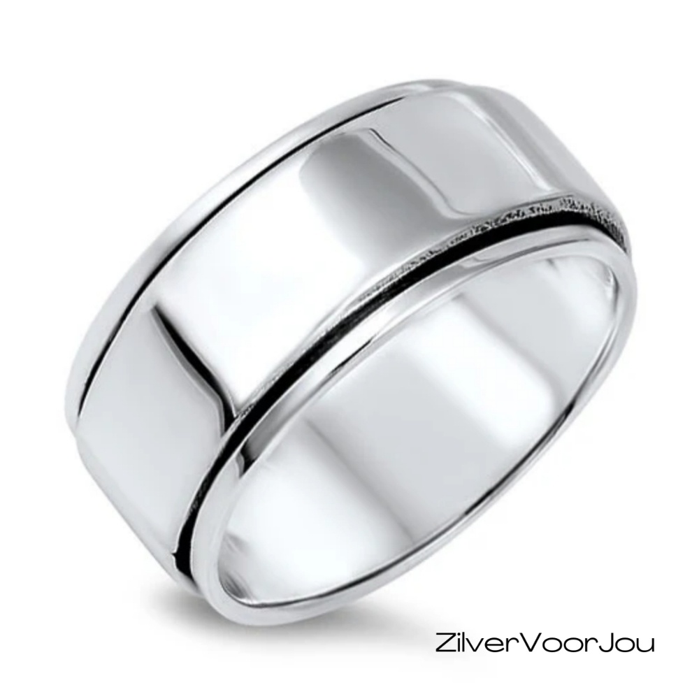 Deze 925 zilveren brede spinner ring is modern en strak van design. De ring bestaat uit een vaste binnenring en een glad gepolijste buitenring die vrij om de basis draait. Dit geeft niet alleen een stijlvolle uitstraling, maar ook een rustgevend gevoel tijdens het dragen. Dit wordt ook wel de anti-stress ring genoemd. Stress? draai de ring!
