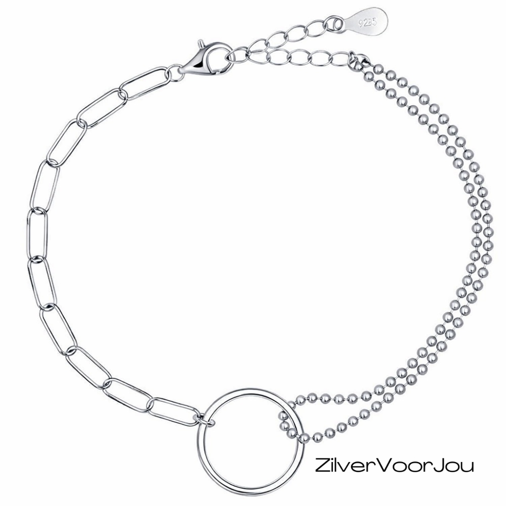 Asymetrische cirkel armband. Een karma armbandje met 2 verschillende schakel kettinkjes. Aan een zijde een bolletjes schakel en aan de andere zijde een staple schakel. Prachtig verfijnd design armbandje.