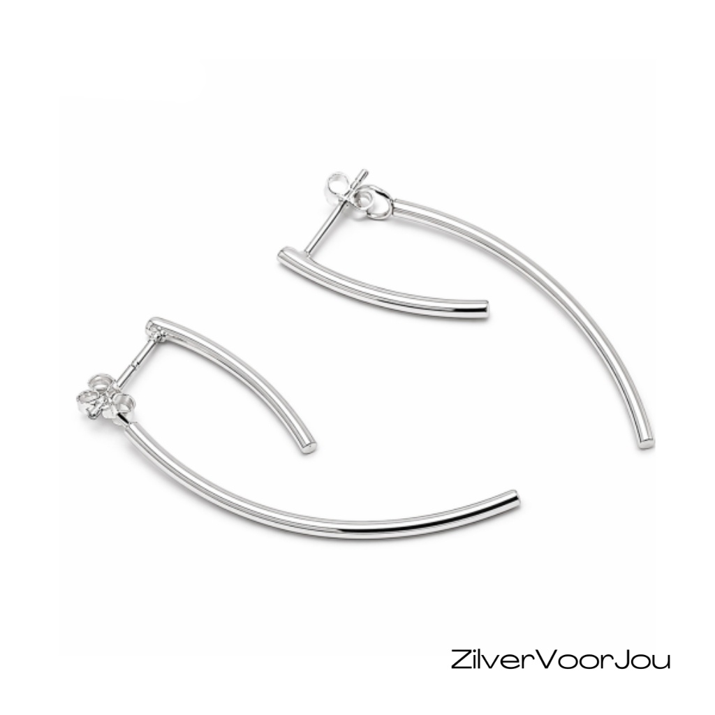 Mooie curved jacket oorbellen, stekers. Mooie curved studs met een achterkantje met een lange curved staaf. Gemaakt van 925 zilver. De totale lengte van de oorstekers is circa 45 mm. De gebogens staafjes zijn 2 mm dik