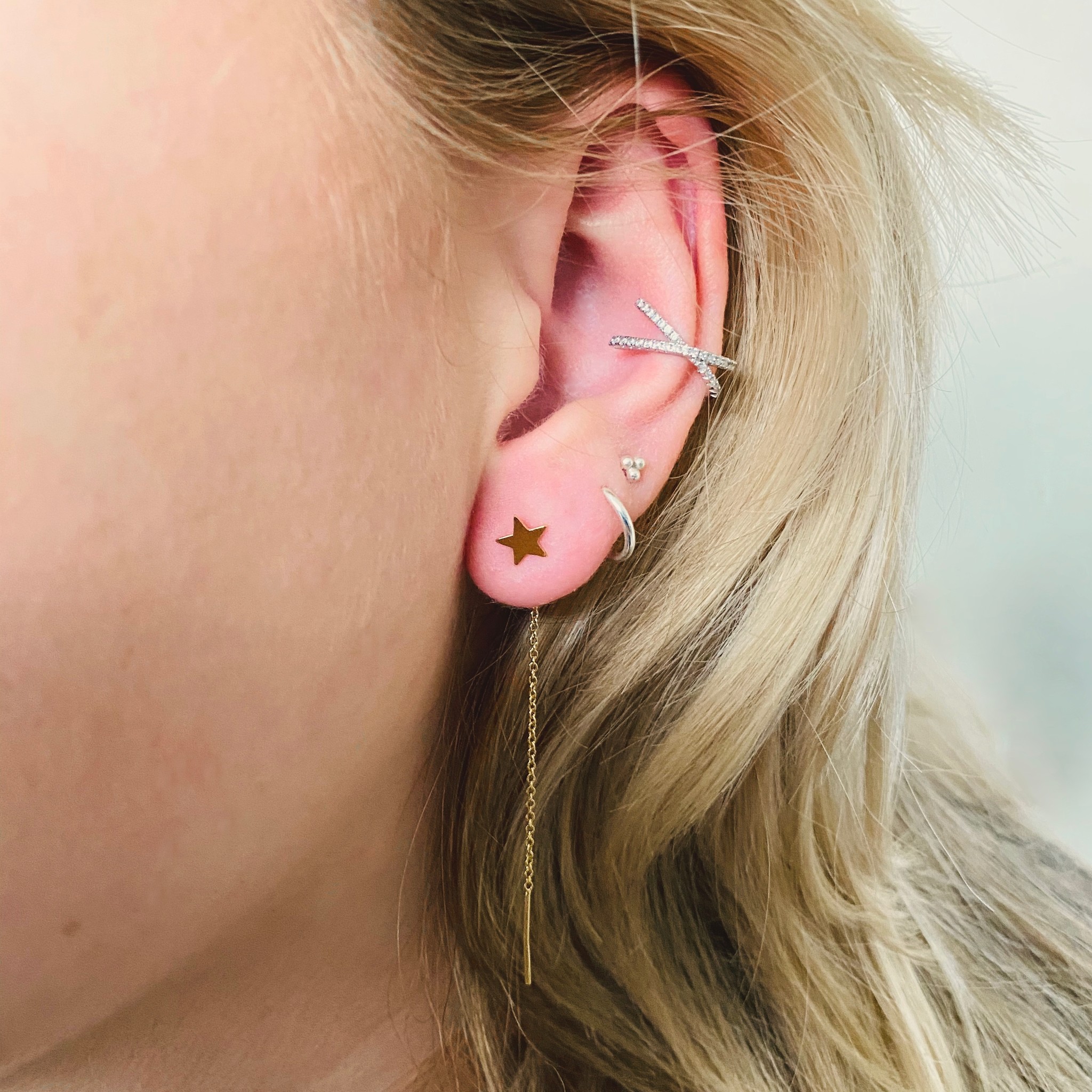 Gold plated 925 zilveren trendy ster threaders. Deze vergulde doorhaaloorbellen hebben een totale lengte van 58 mm en het sterretje is 5 mm groot.