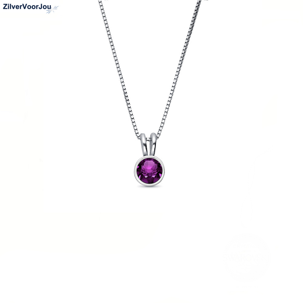 Prachtige zilveren ketting met amethist paarse kristal. De ronde kristal straalt elegantie en rust uit, perfect om je outfit een luxueuze en stijlvolle touch te geven.