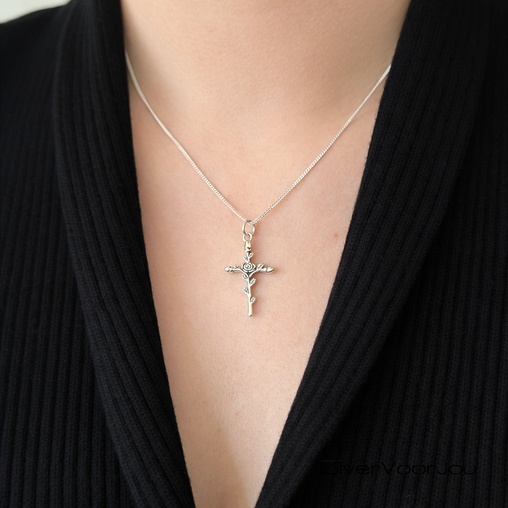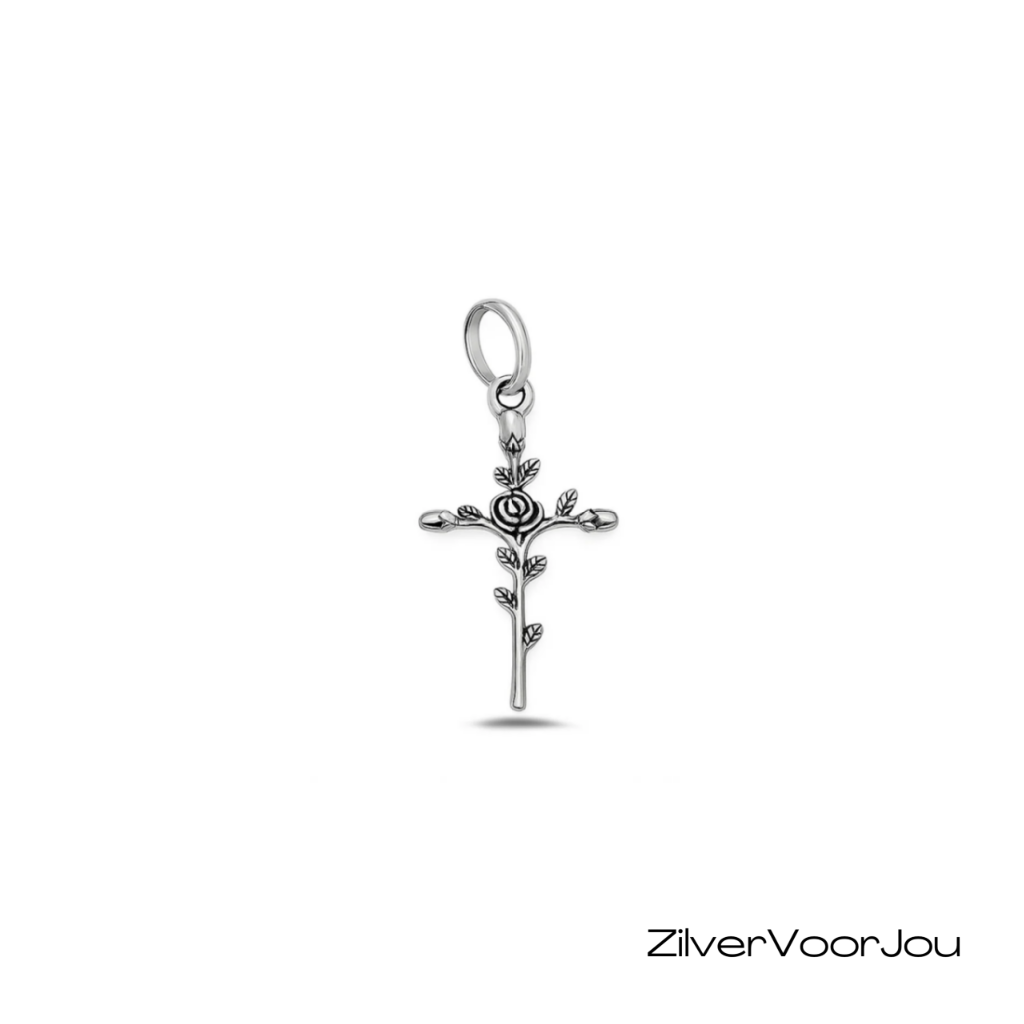 Deze elegante kruis hanger van 925 zilver is een bijzonder sieraad met een romantisch detail. In het midden van het kruis is een kleine roos verwerkt, omringd door fijne blaadjes die langs het kruis lopen. De oxidatie in het zilver benadrukt de details en geeft het ontwerp een mooie, licht vintage uitstraling.