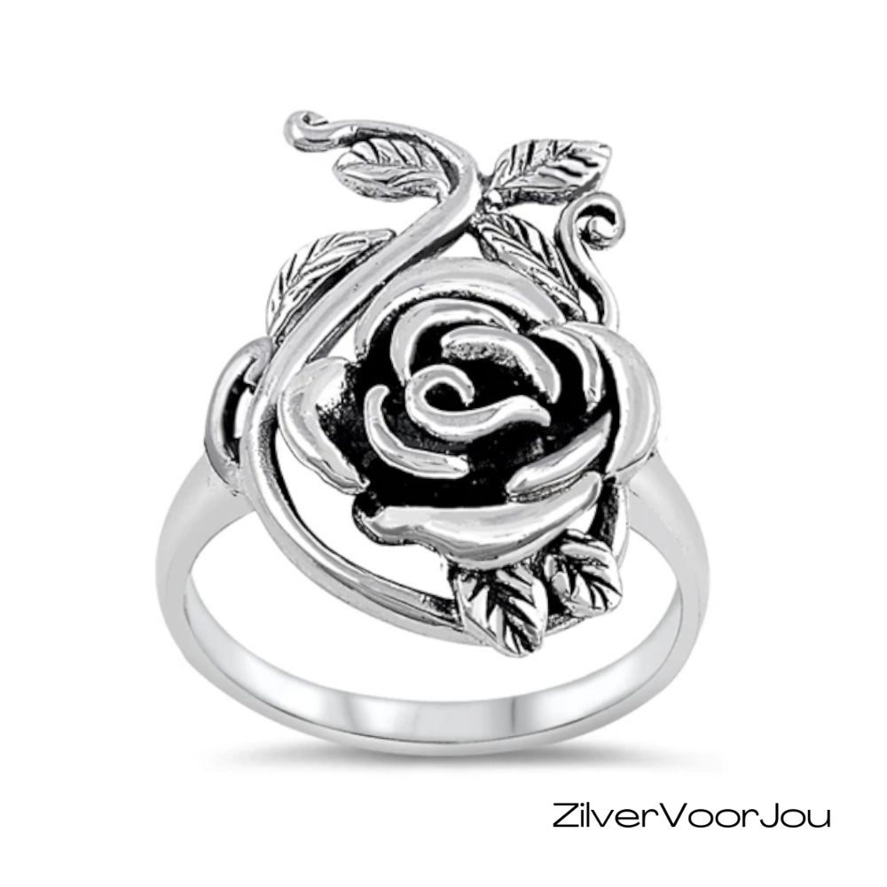 Prachtige echt zilveren ring met een roos en blaadjes. De ring heeft een ringkop van 26 mm (de ring ligt 26 mm lang op de vinger)