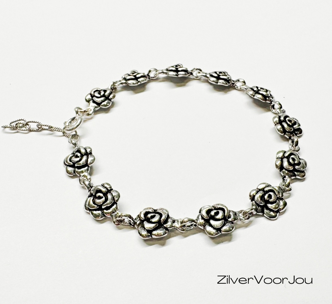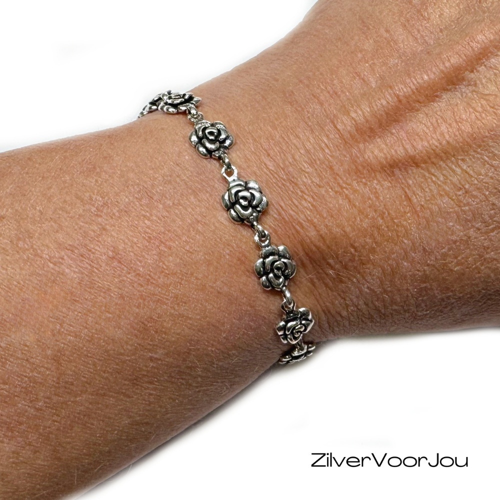 Deze romantische armband is gemaakt van geoxideerd 925 zilver en bestaat uit prachtig roosjes. De oxidatie zorgt voor een donkere, schaduwlijn rondom de bloemblaadjes, waardoor het rozenmotief extra diepte en karakter krijgt.