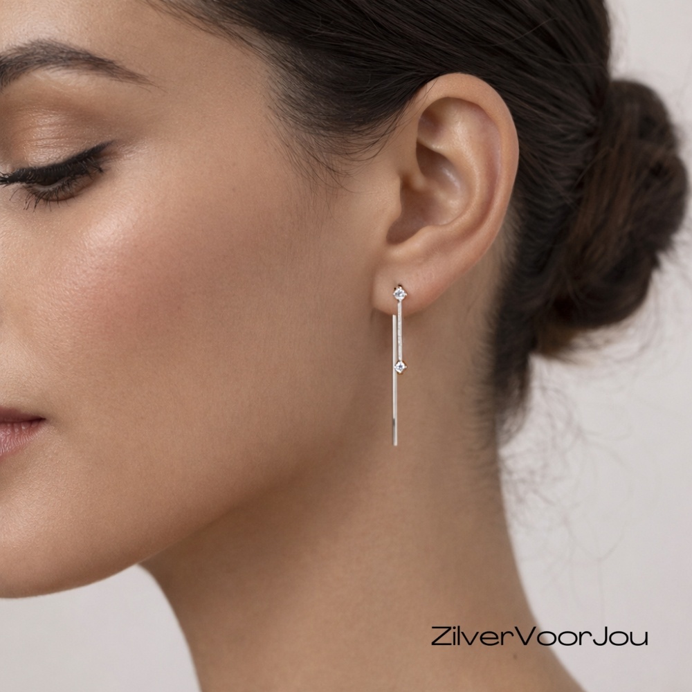 Simplicity, less is more geldt voor deze design oorhangers. Twee kleine blinkende diamant geslepen (CZ) zirkonen in een strak vormgegeven zilveren draad. Unieke verfijnde oorhangers.