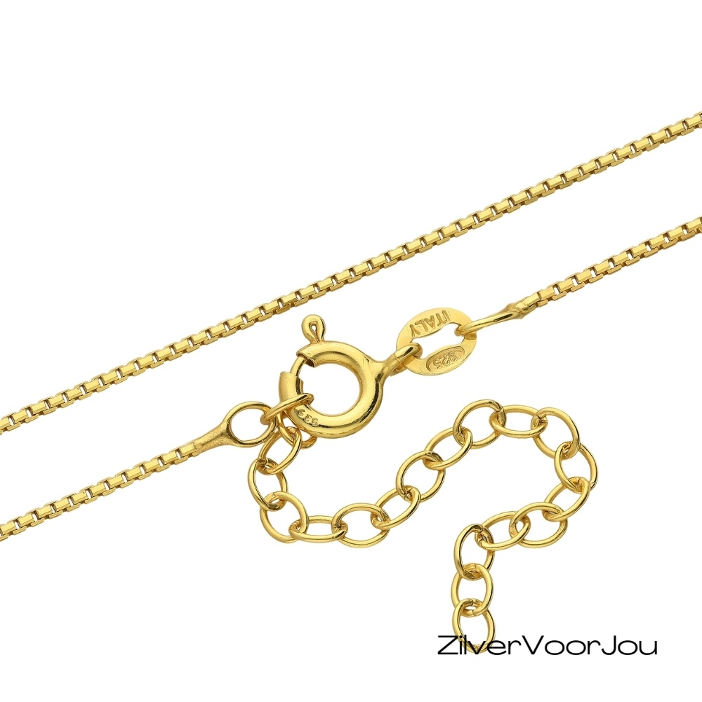 Let op: de ketting is niet inbegrepen, maar kan apart worden bijbesteld. De ketting is een 0,5 micron gold plated echt zilveren 1 mm box ketting van 40 cm met een verlenging naar 45 cm. Heb je liever een andere ketting, kijk dan even bij onze collectie lengte kettingen.