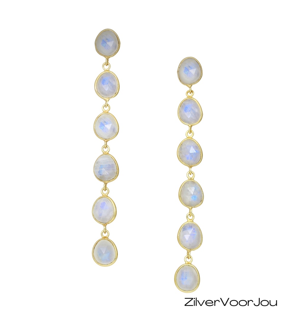 Deze lange gold plated oorhangers met regenboogmaansteen zijn een prachtig voorbeeld van elegante eenvoud. De oorbellen zijn gemaakt van 925 zilver en verguld met een 0.3 micron gold plated laag (E-coat), wat zorgt voor een warme glans en extra bescherming.