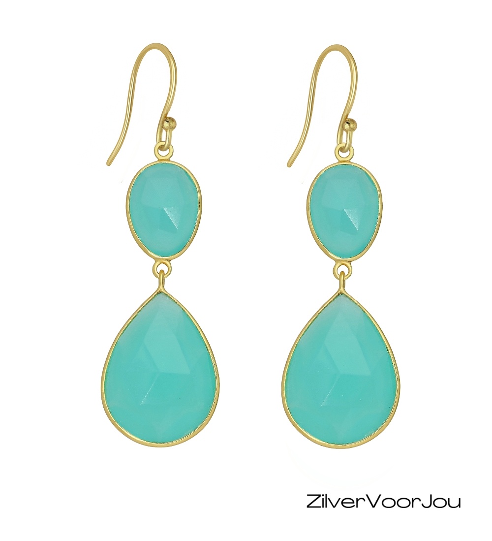 De oorhangers zijn gezet met aqua chalcedoon stenen — prachtig gefacetteerd om het licht op een subtiele manier te vangen. De druppelvormige steen zorgt voor een sierlijk en vrouwelijk effect.