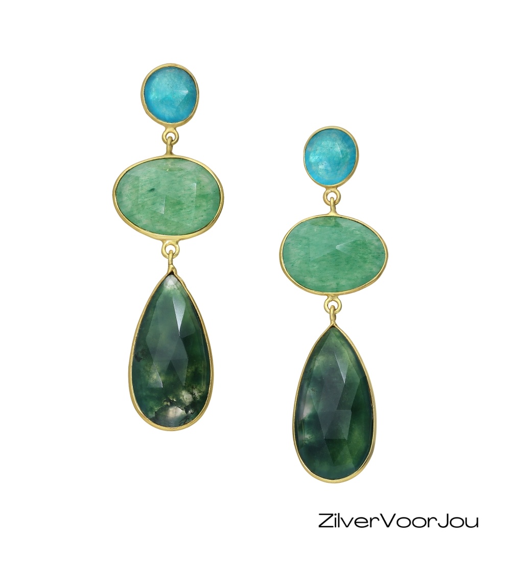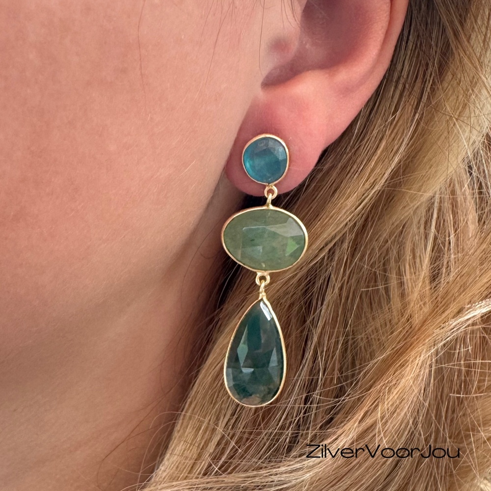 Deze prachtige oorbellen zijn gemaakt van 925 zilver en voorzien van een gold plated laag (0.3 micron). Het ontwerp is bezet met drie verschillende groene edelstenen die elkaar perfect aanvullen: