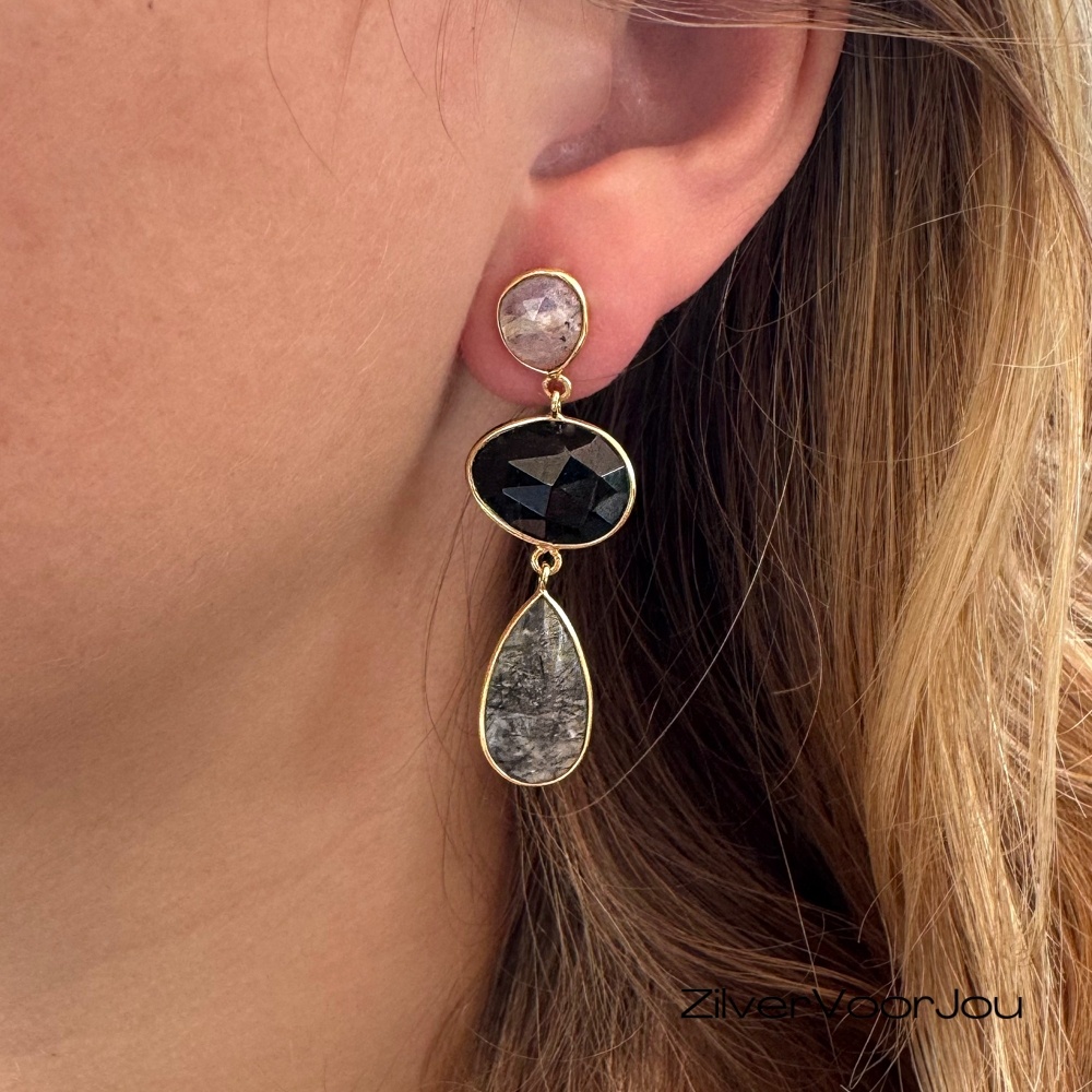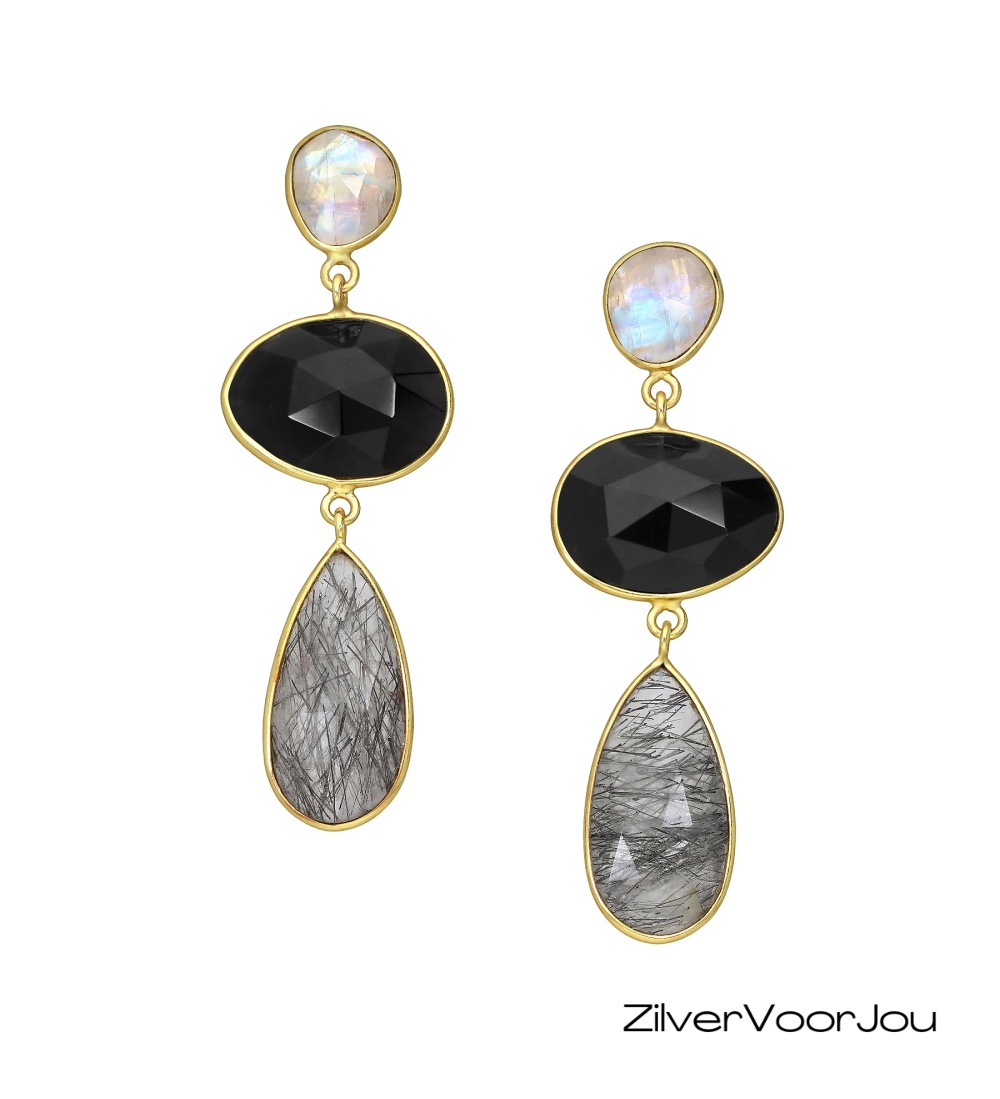 Oorbellen zilver gold plated met rutielkwarts, onyx en maansteen