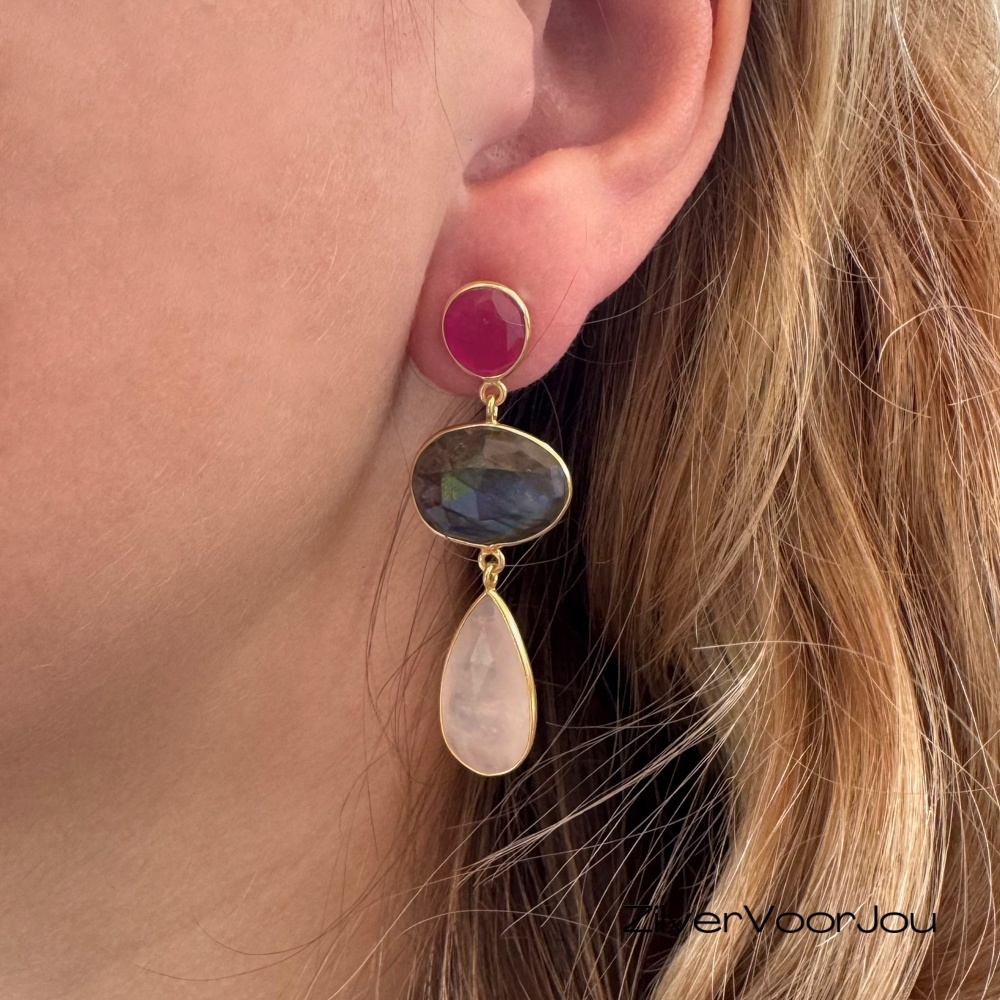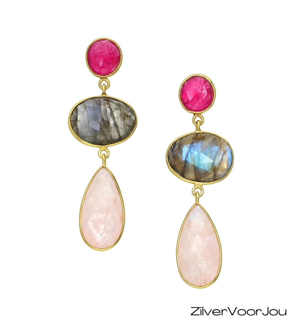 Oorstekers zilver gold plated met roze jade, labradoriet en rozenkwarts