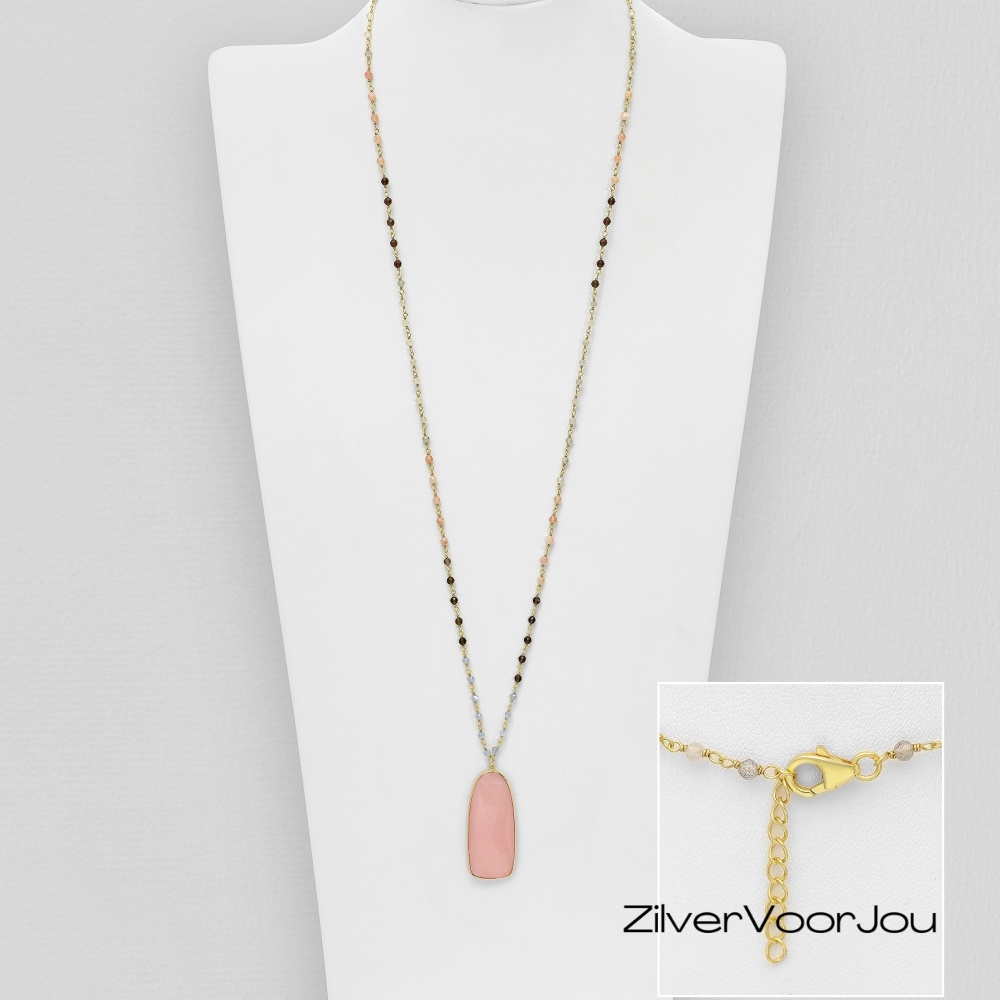 Zilveren gold plated lange ketting bezet met peach maansteentjes, smokey kwarts, en rozenkwarts met daaronder een grote rozenkwarts kettinghanger gezet in een 925 zilveren gold plated frame setting.