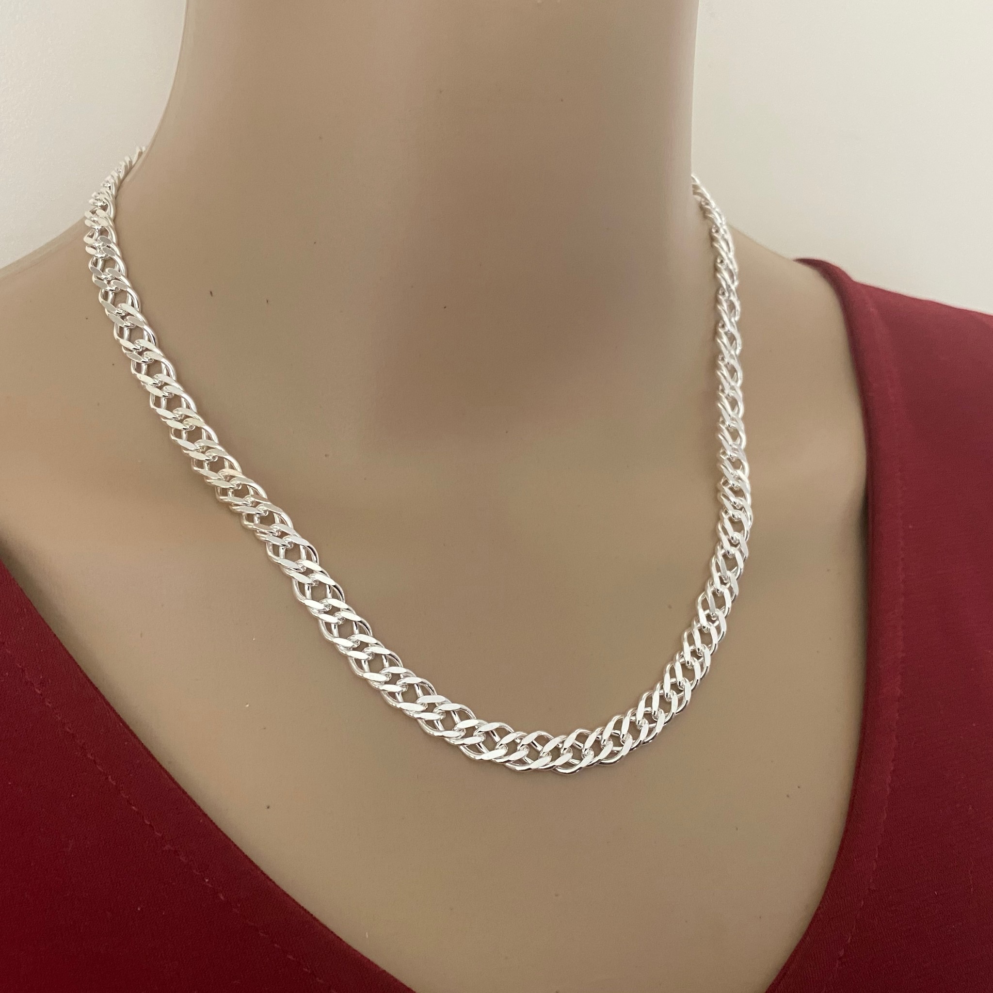 Dubbele gourmet of rombo schakelketting . Schitterende brede dames of heren ketting. De ketting heeft een lengte van 45 cm. De schakel is 6,7 mm breed en 2.6 mm dik. Gemaakt van 925 zilver en nikkel vrij. De ketting heeft een gewicht van 26 gram
