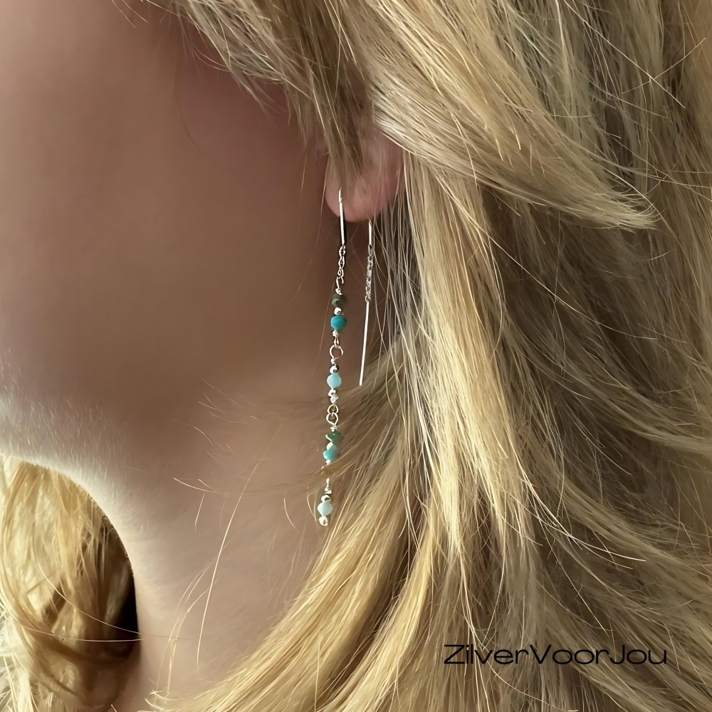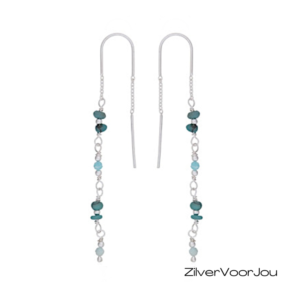 Erg leuke en vrolijke doortrek oorbellen met echte amazoniet en turkoois steentjes. Gemaakt van 925 zilver. De steentjes zijn circa 3.5 mm groot en gefacetteerd.