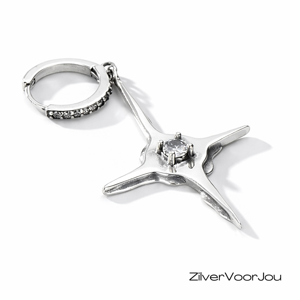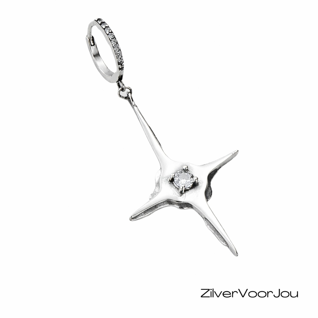 Mooie grote ster hanger met in het midden een witte cubic zirkonia. De hanger hangt aan een huggie hoop die ook is ingelegd met witte zirkonia's aan de voorkant. Schitterende grote oorhanger. Wordt verkocht per stuk. Je kunt in je andere oor een mooi klein knopje of een andere hanger dragen.