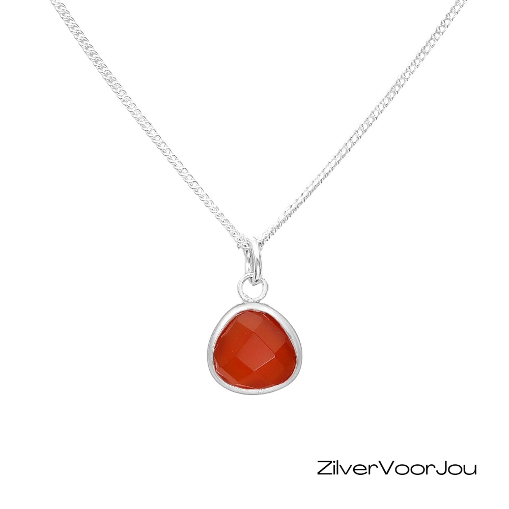 Deze zilveren ketting is voorzien van een druppelvormige, facetgeslepen carneool – een warme oranje-rode edelsteen die symbool staat voor levenskracht, moed en creativiteit.