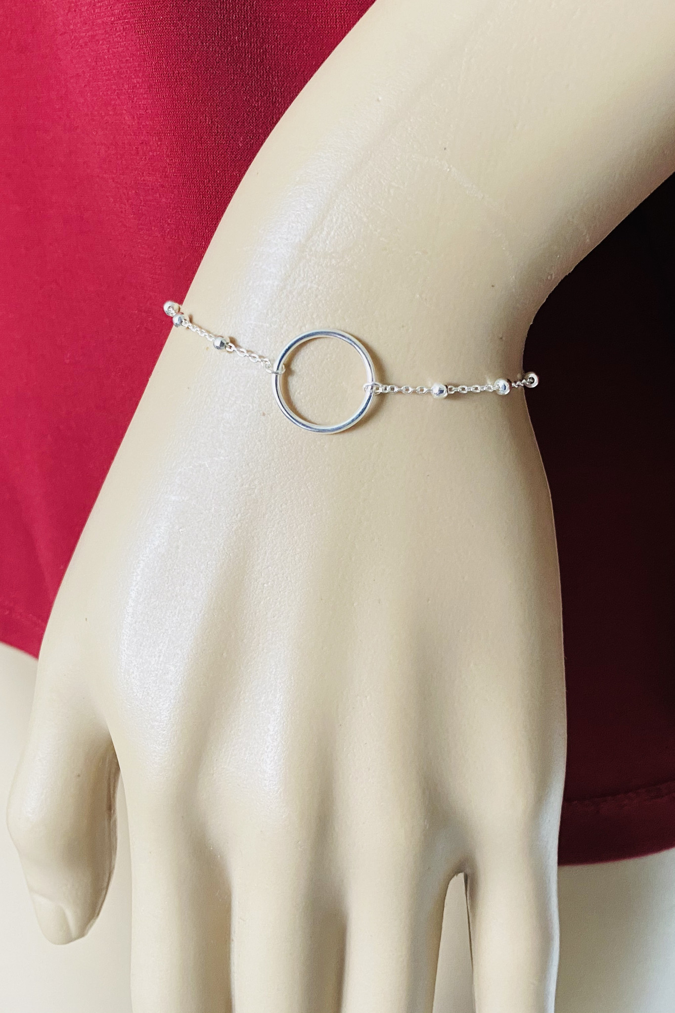 Elegant klein juweeltje voor je pols. 925 zilveren karma cirkel armbandje met een bolletjes chain. Het armbandje heeft een lengte van 15 cm verstelbaar naar 18,75 cm. De cirkel heeft een diameter van 15 mm en de balletjes hebben een diameter van 2 mm.