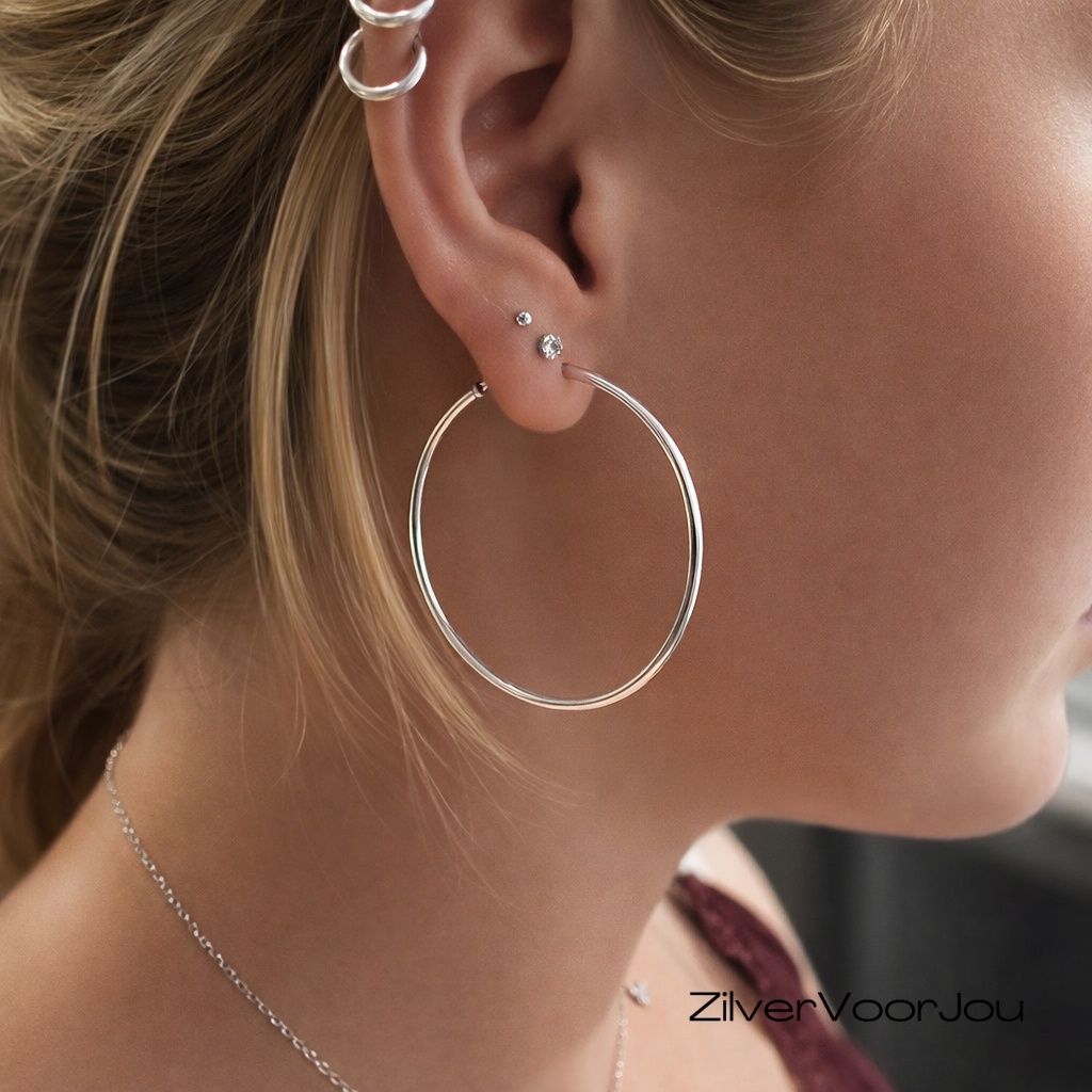 Echt zilveren creolen oorringen van 4.5 x 4.5 cm en met een ronde buis van 1.5 mm breed.