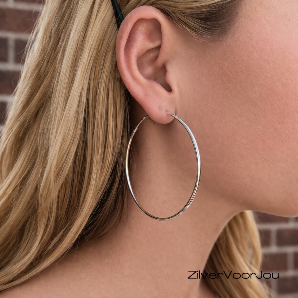 Echt zilveren creolen oorringen van 6 x 6 cm en met een ronde buis van 2 mm breed.