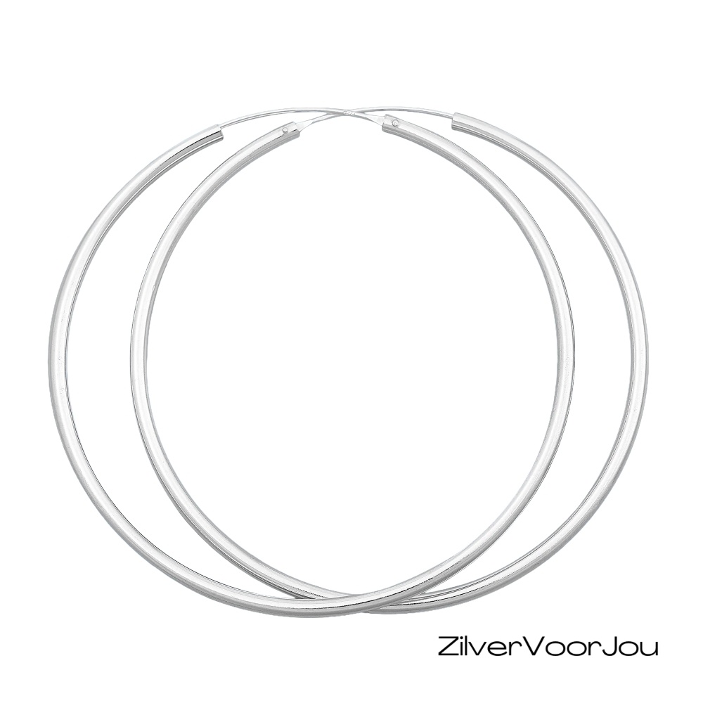 Echt zilveren grote creolen oorringen met een diameter van 7 cm en met een ronde buis van 2.5 mm breed.