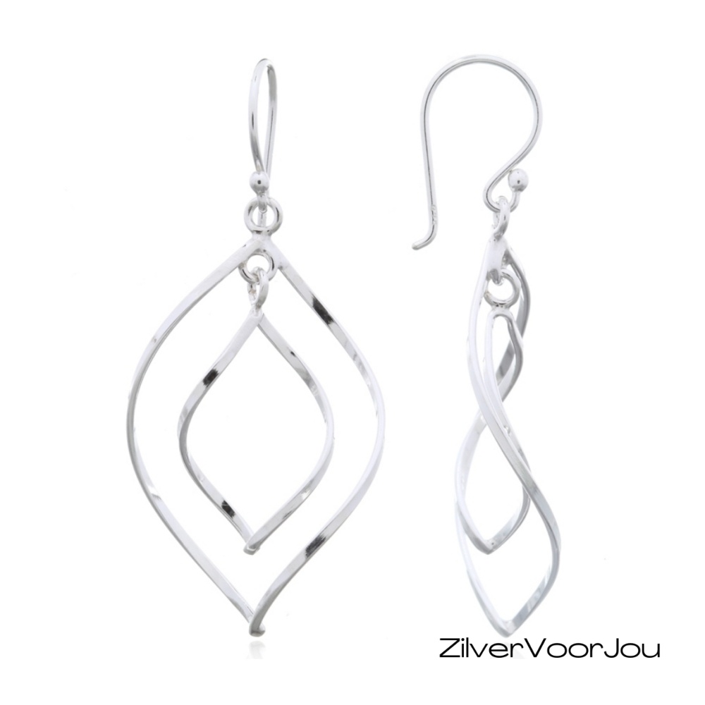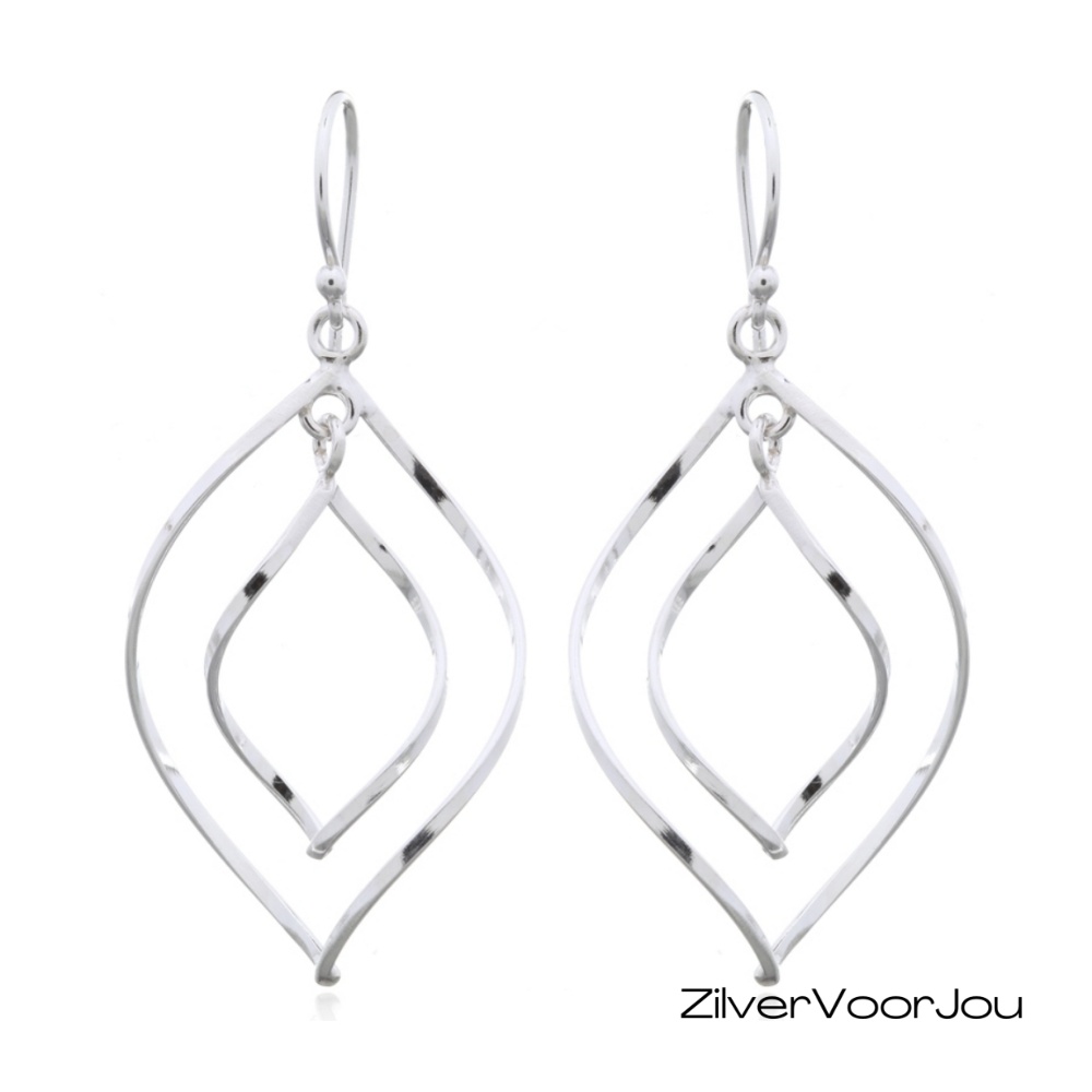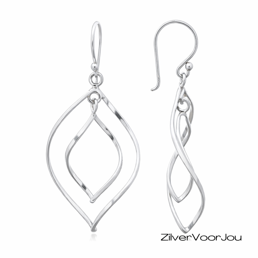 Deze fijne 925 zilveren oorbellen zijn vormgegeven met een elegante dubbele open bladvorm, waarbij een kleiner blad sierlijk in het grotere blad zweeft. De oorbellen zijn handgemaakt uit gedraaid vlak draad, wat zorgt voor een speels lichtspel en een moderne uitstraling. Door het luchtige ontwerp bewegen ze soepel mee, waardoor ze extra elegant ogen tijdens het dragen.