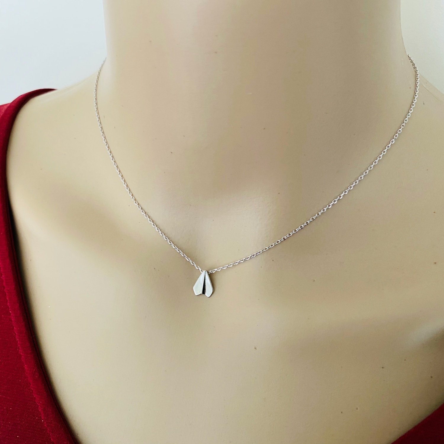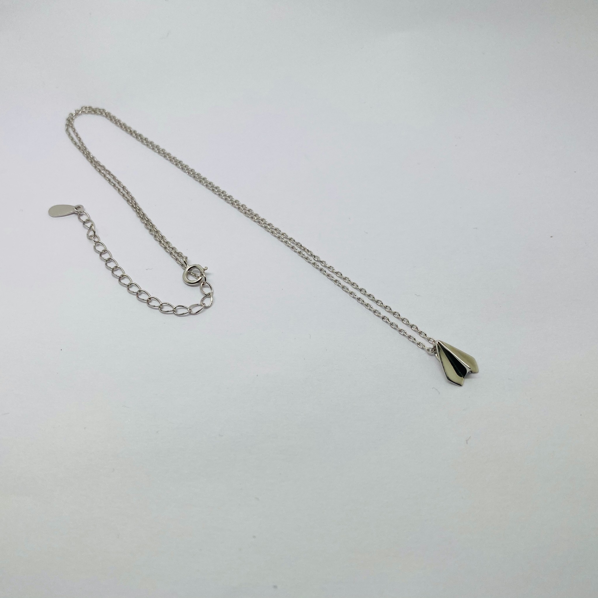 Zo lief dit kettinkje met een gevouwen zilveren vliegtuigje. Gemaakt van 925 zilver. Kettinglengte is 40 cm met 5 cm verlenging naar 45 cm.