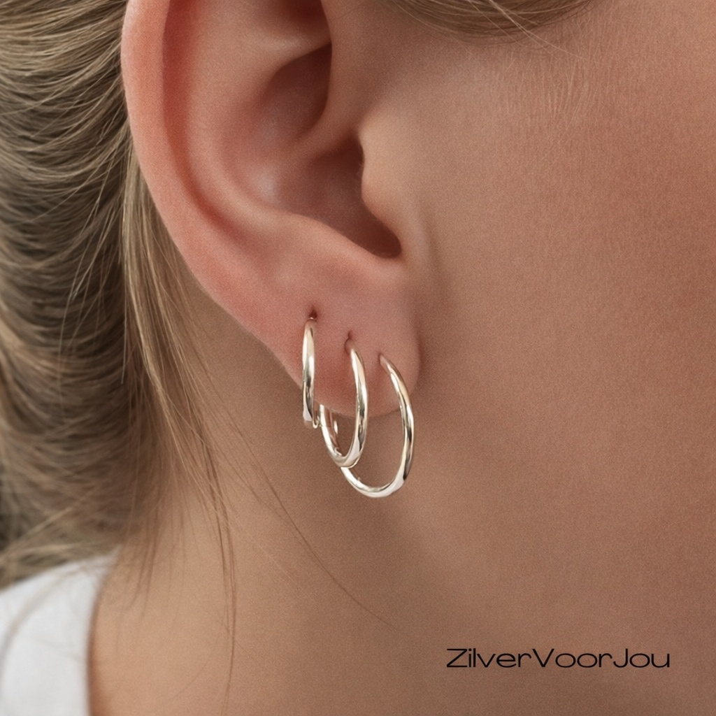 Deze huggie hoops zijn gemaakt van echt zilver en hebben een diameter van 9 tot 19 mm. De dikte van de ronde buis is 1.5 mm. De oorringen openen en sluiten met een handige klik sluiting.