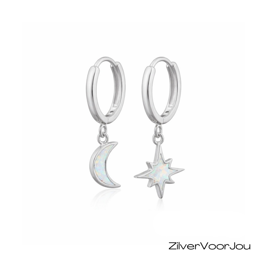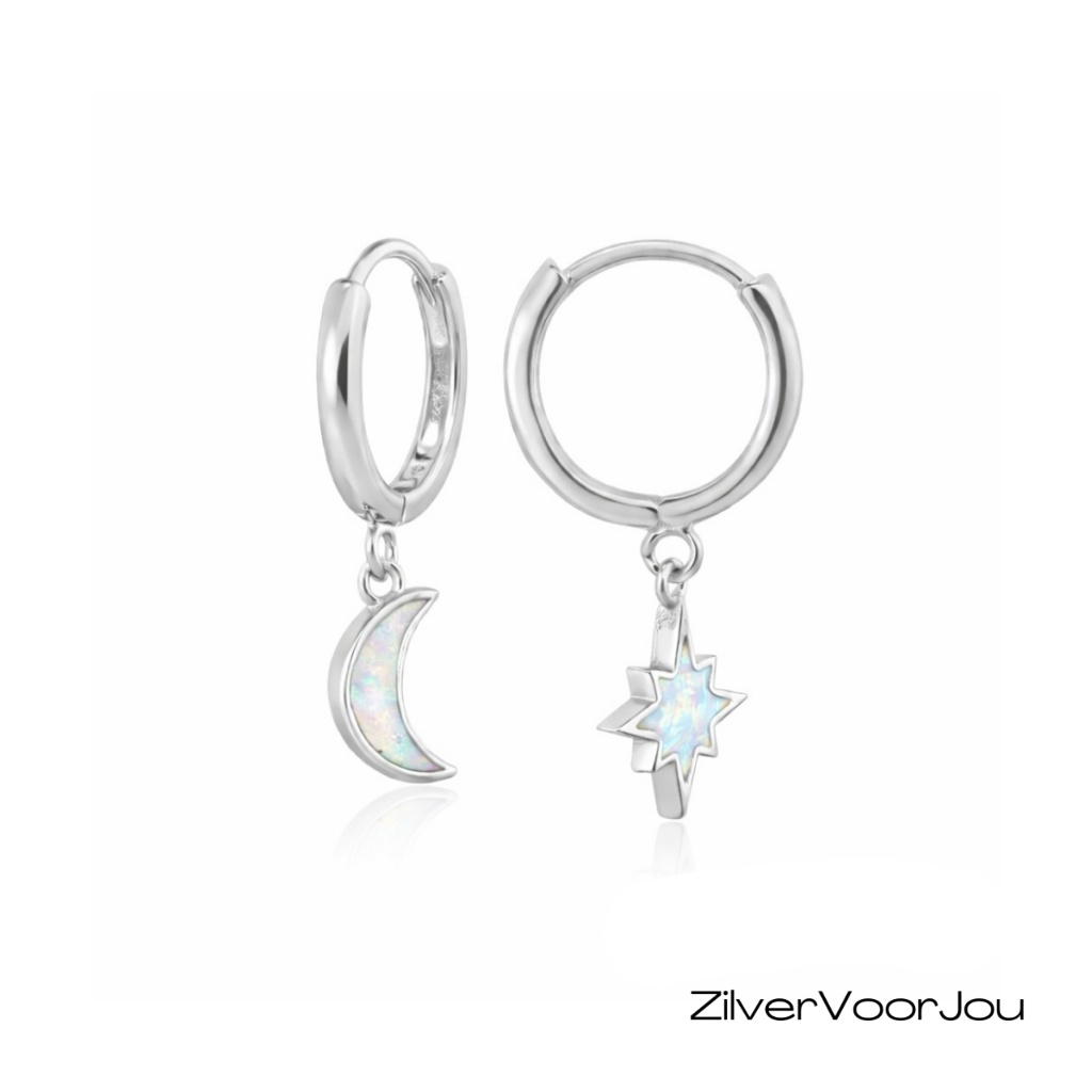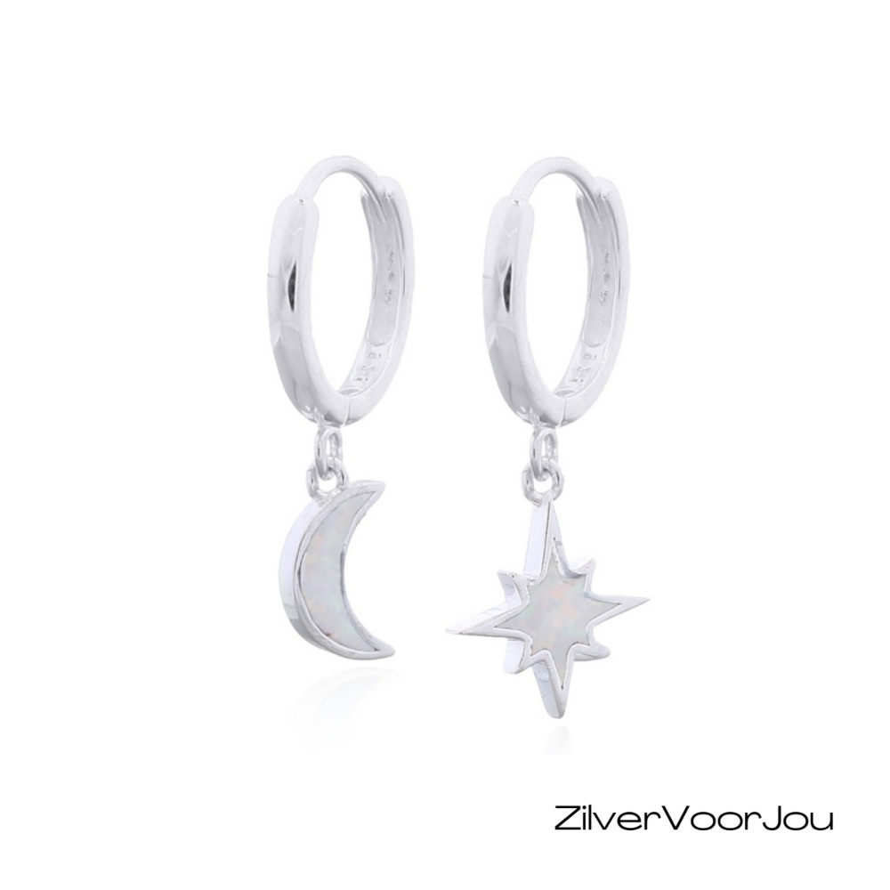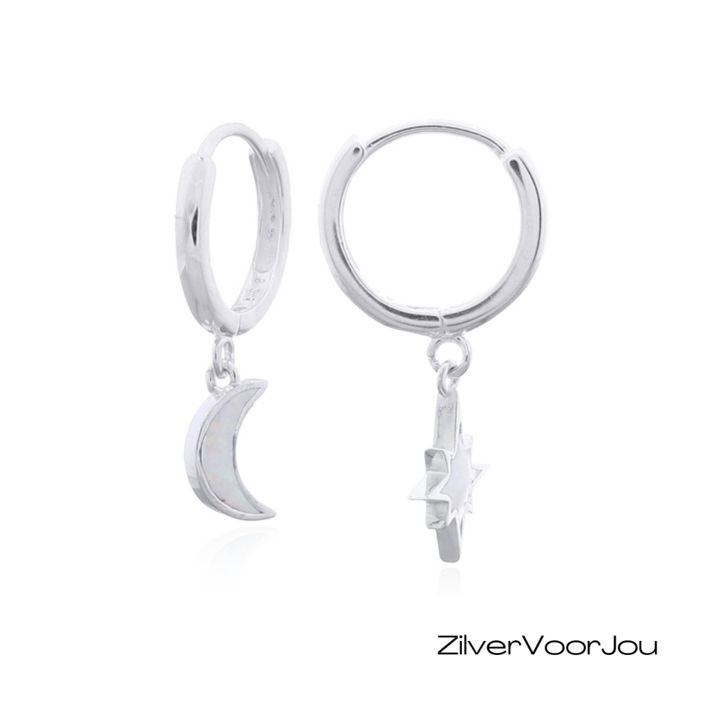 Deze 925 zilveren huggie oorringen of klapcreolen hebben een mooie maan- en sterbedel, beide ingelegd met witte opaal. De oorbellen zijn licht van gewicht en eenvoudig te combineren met andere minimalistische ringen of kettingen.