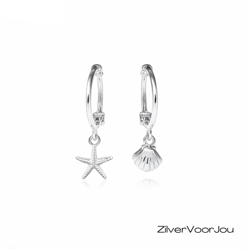 Superleuk deze kleine hugging oorringetjes met een zeester en schelp bedeltje. Gemaakt van 925 zilver. Top om te dragen in meerdere gaatjes in een oor. De oorringen hebben een diameter van: