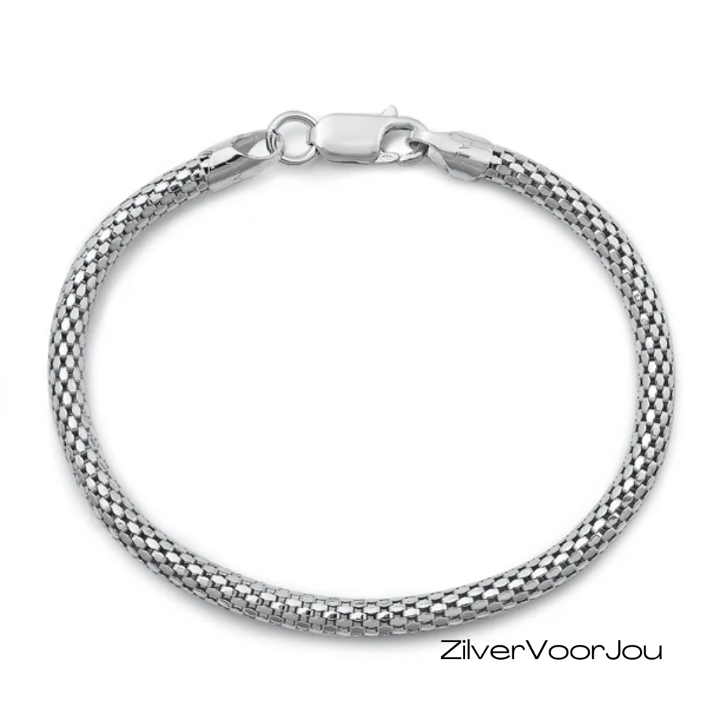 Elegant Italiaans design mesh armband. Gemaakt van 925 zilver en prachtig afgewerkt met een rhodium laag. De armband is rond en heeft een diameter van 2.8 mm. De totale lengte van de armband is 19 cm. Door de dikte van 2.8 mm valt deze armband kleiner dan een standaard armbandje van 19 cm.