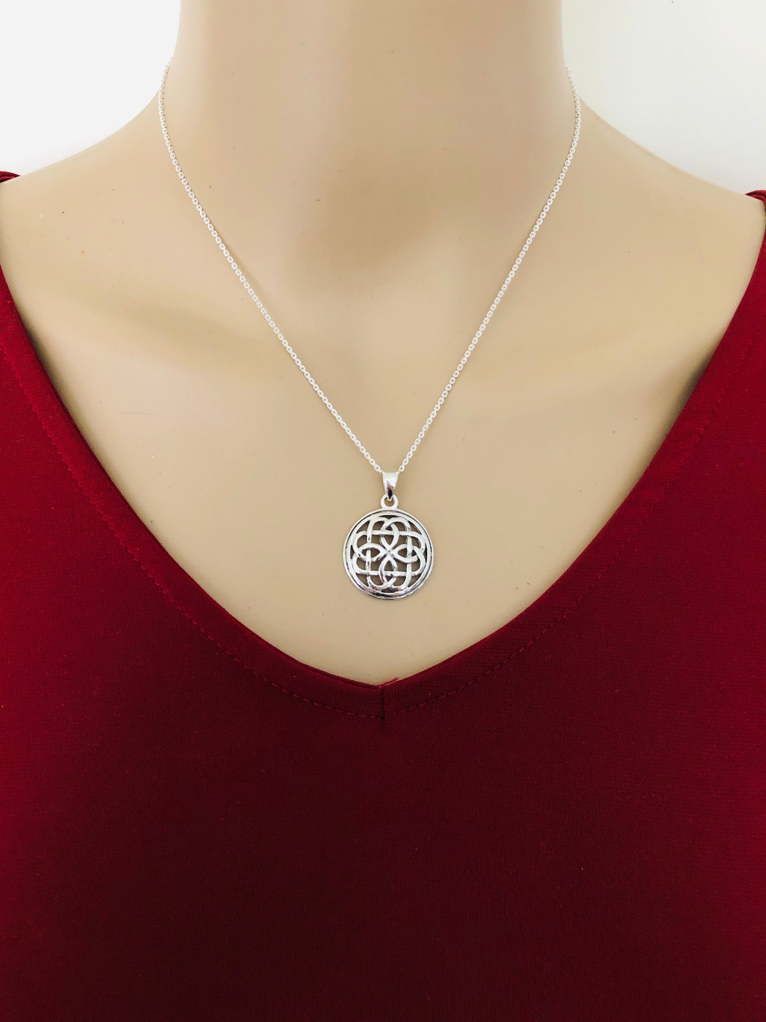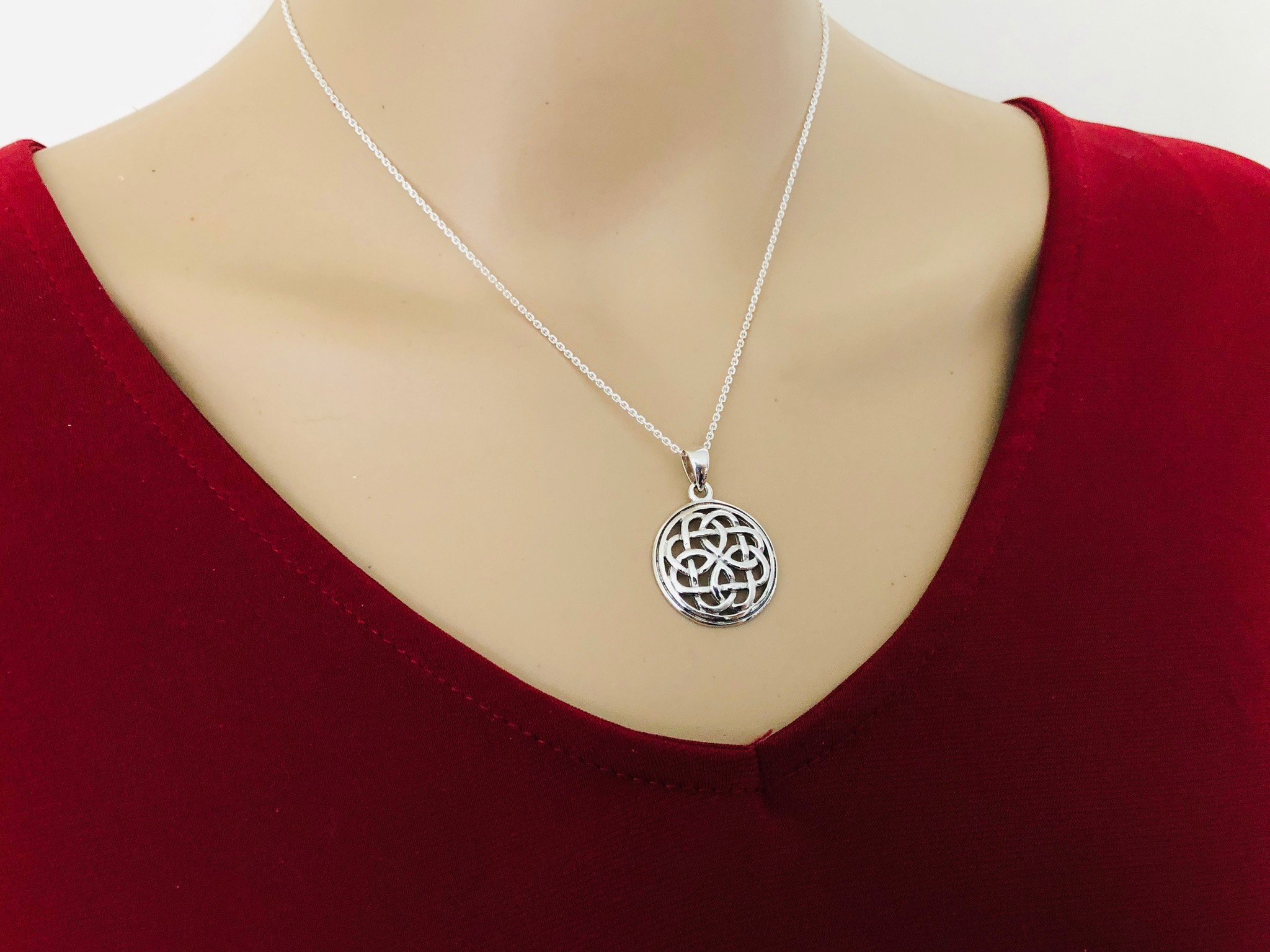 925 zilveren rond Keltisch kruis hangertje. Deze hanger heeft een cirkel met daarin een eindeloze lijn van lussen die staan voor de vier seizoenen vier windstreken of familie met elkaar verbonden.