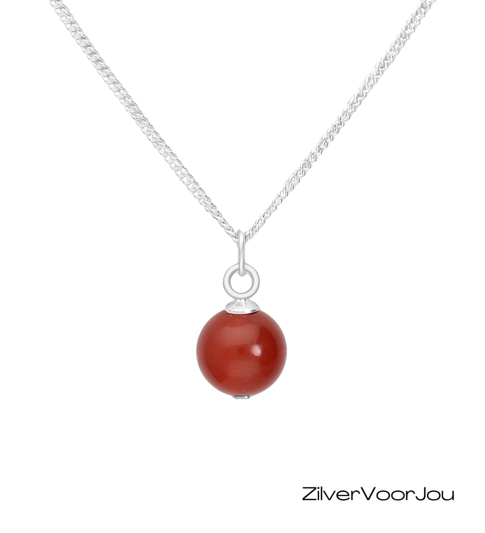 Deze zilveren ketting met carneool bolhanger is warm en elegant. De hanger bestaat uit een gladgepolijste, ronde carneool edelsteen van 8 mm – bekend om zijn warme oranjebruine tint en zijn symboliek voor moed, energie en creativiteit. De ketting is gemaakt van 925 sterling zilver en heeft een verstelbare lengte.