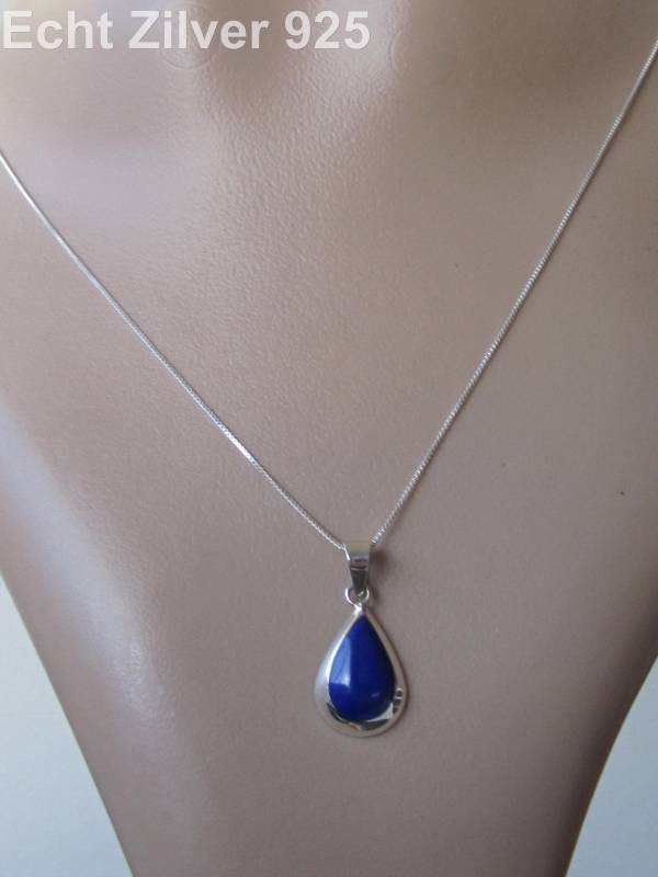 Echt zilveren ketting met prachtige zilveren druppel hanger ingelegd met lapis lazuli blauwe resin.