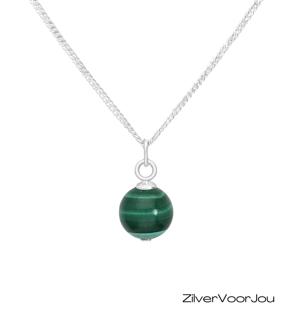 Deze zilveren ketting met malachiet bolhanger is prachtig. De hanger bestaat uit een gladgepolijste, ronde malachiet edelsteen van 8 mm – herkenbaar aan haar diepe groene kleur met kenmerkende, natuurlijke lijnen en patronen.