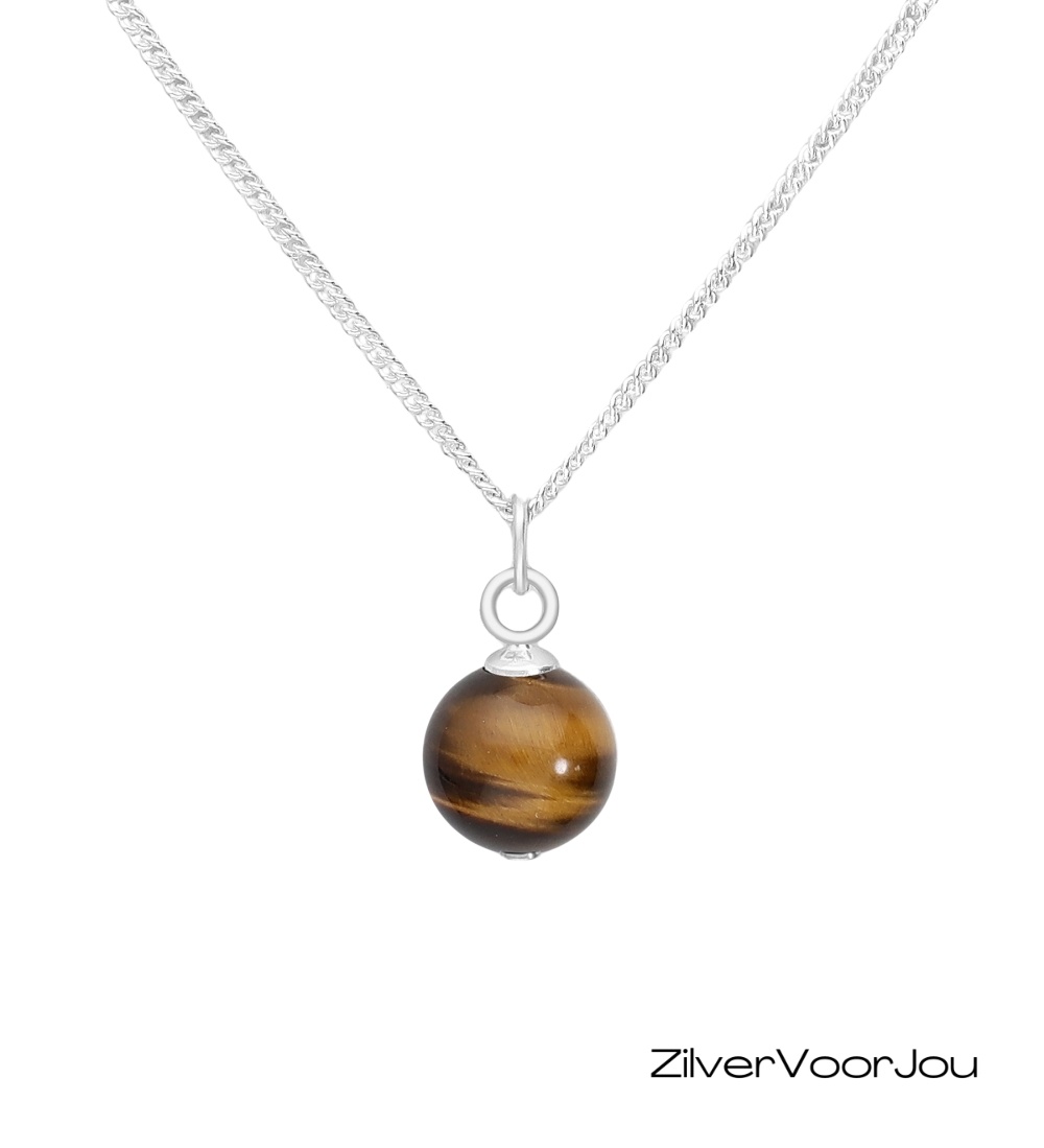 Deze zilveren ketting met tijgeroog bolhanger combineert schoonheid met krachtige symboliek. De hanger bestaat uit een gladgepolijste, ronde tijgeroog edelsteen van 8 mm – herkenbaar aan haar warme bruin-gouden gloed en optische lichtreflectie, ook wel ‘chatoyance’ genoemd.