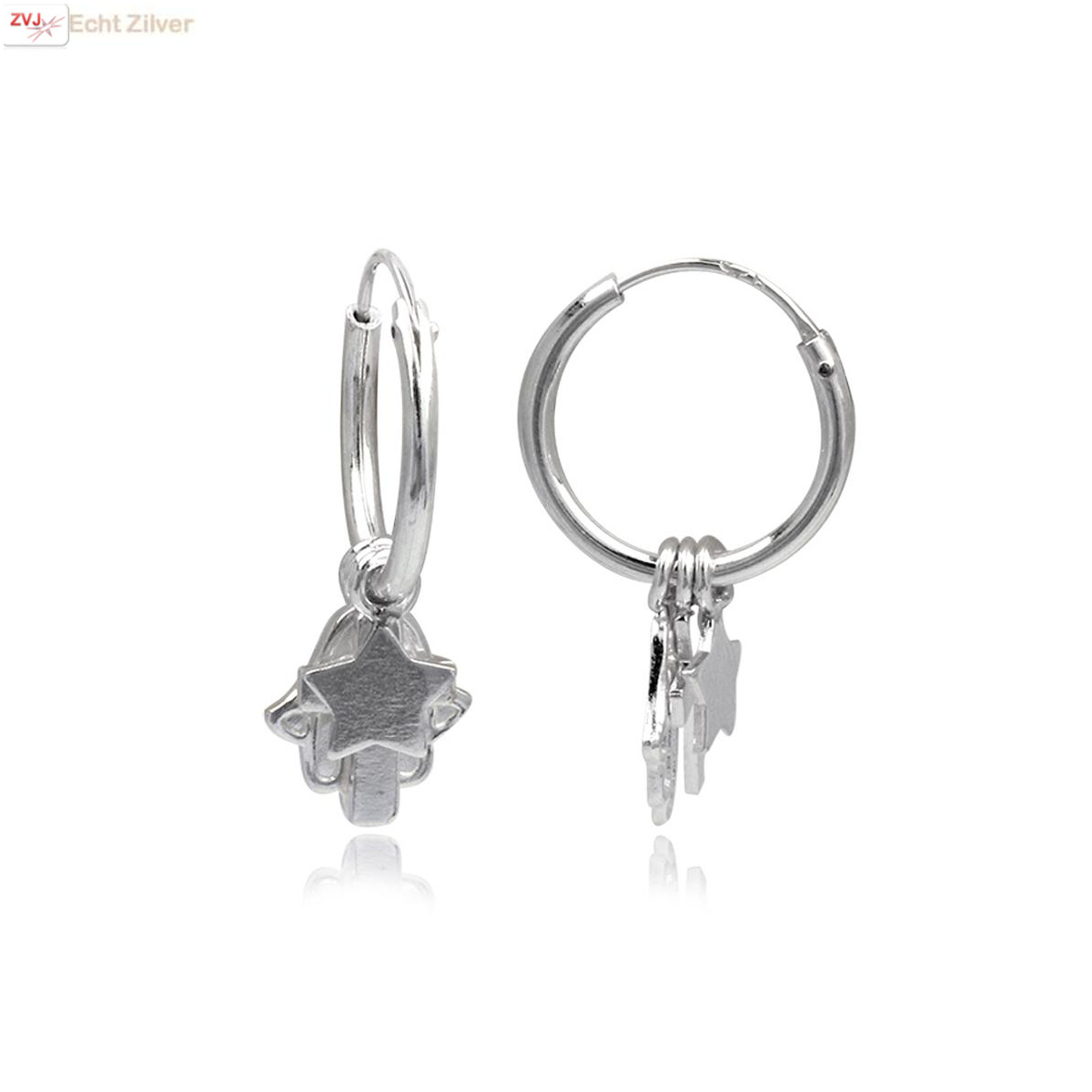 925 Zilveren kleine creolen met 3 bedels. Oorringetjes met een ster een kruis en hamsa hand hangertje.