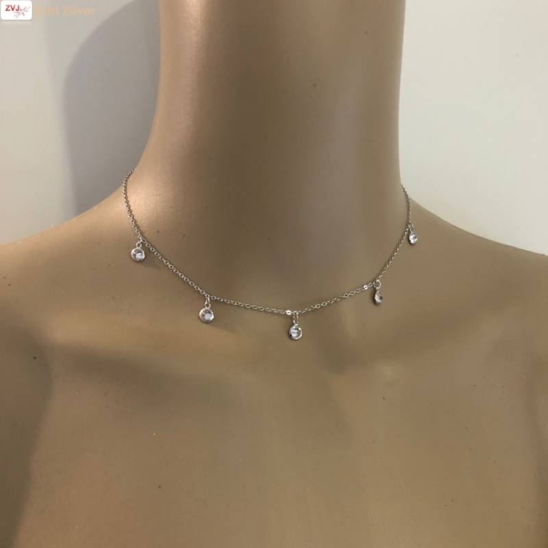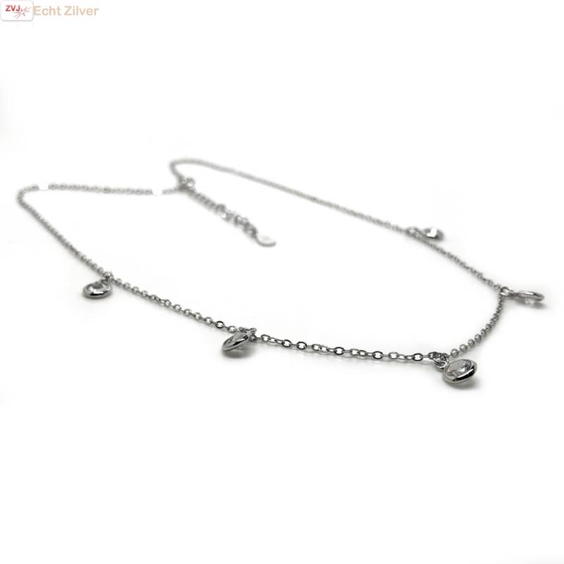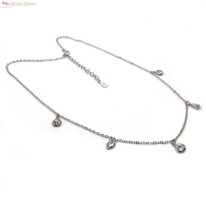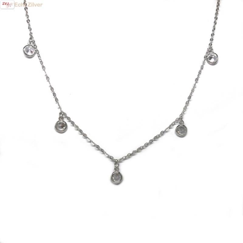 Korte feestelijke ketting van 35 cm met een verlenging naar 40 cm met 5 kleine cirkeltjes met blingende witte zirkonen.