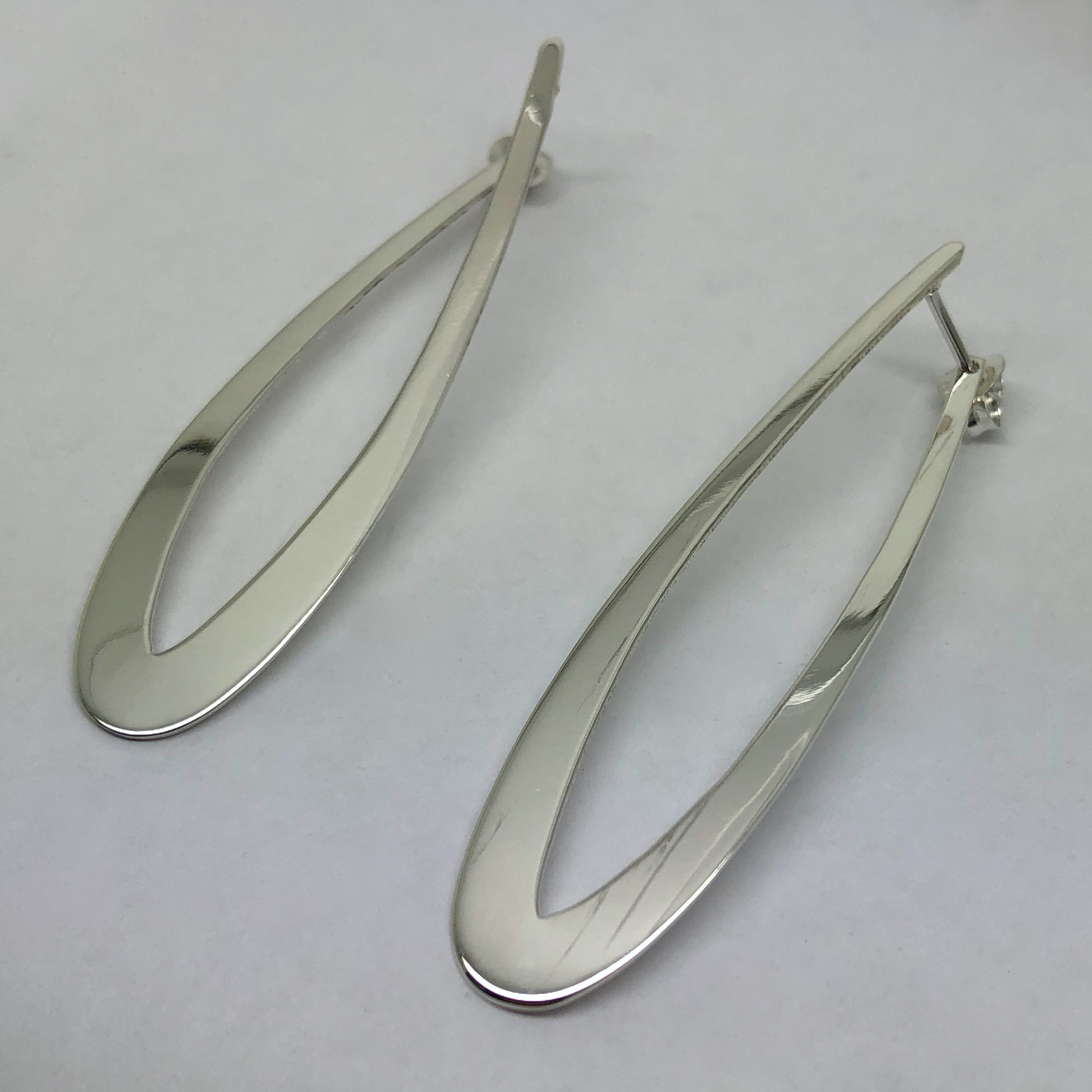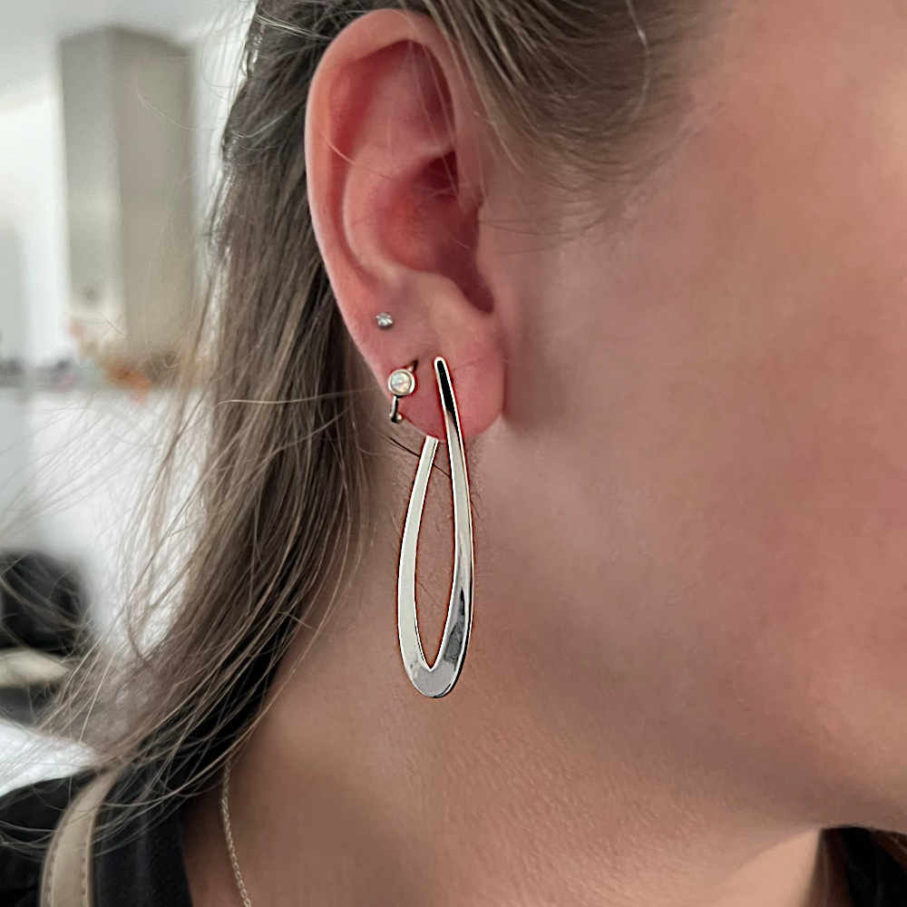 Elegante echt zilveren lange platte ovale oorringen met een steker. De oorring is schuin gebogen zodat je oorlel tussen beide uiteinden van de oorbel zit. Zeer mooi tijdloos design.