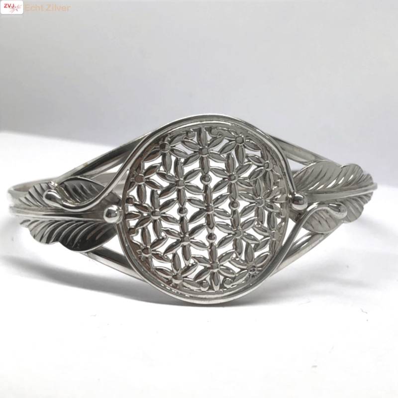 Prachtige brede cuff armband met een levensbloem en blad.Een flower of life.