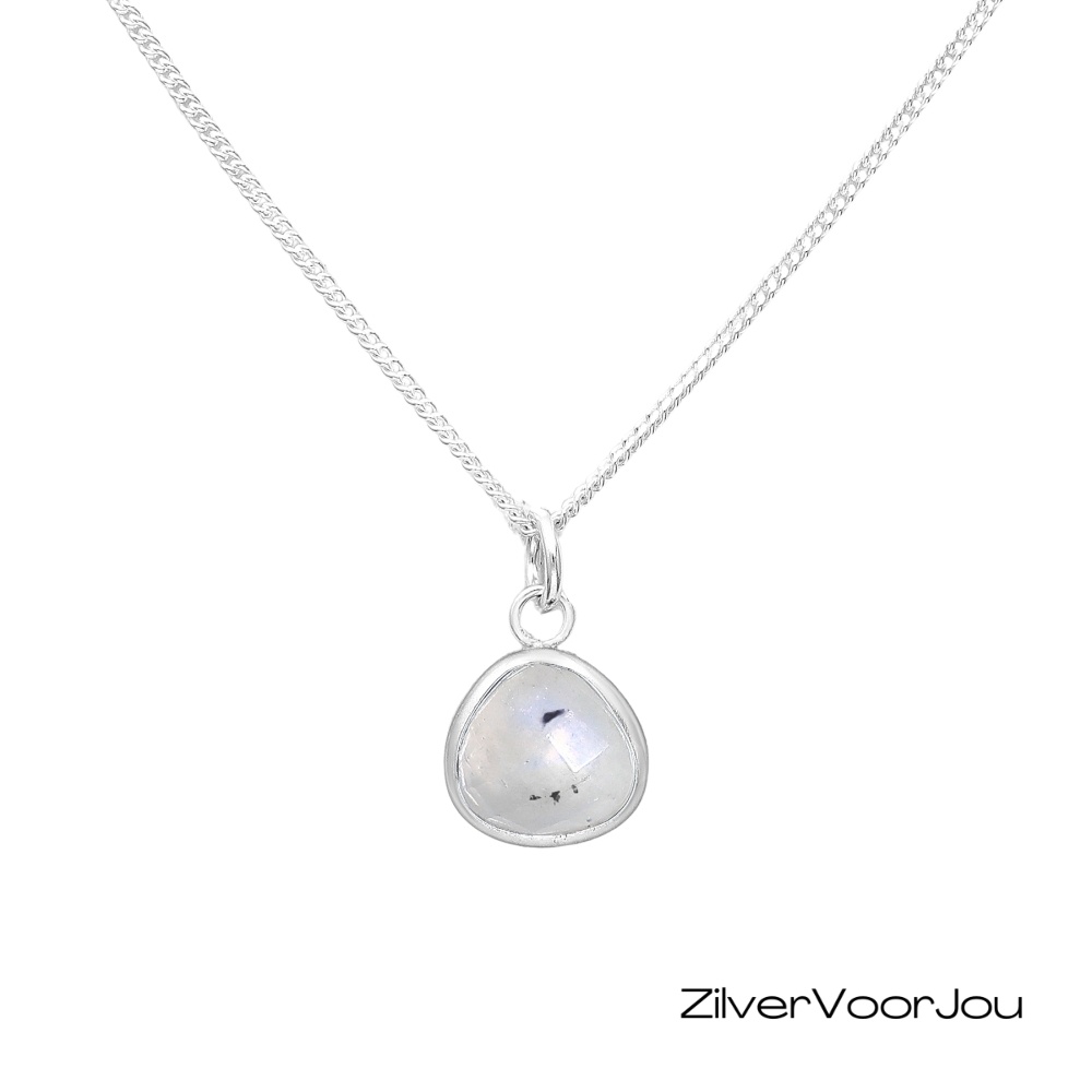 Deze prachtige zilveren ketting is voorzien van een druppelvormige, facetgeslepen maansteen. De steen heeft een zachte, melkachtige kleur met een subtiele blauwe of regenboogachtige glans – ook wel “schijn” genoemd.