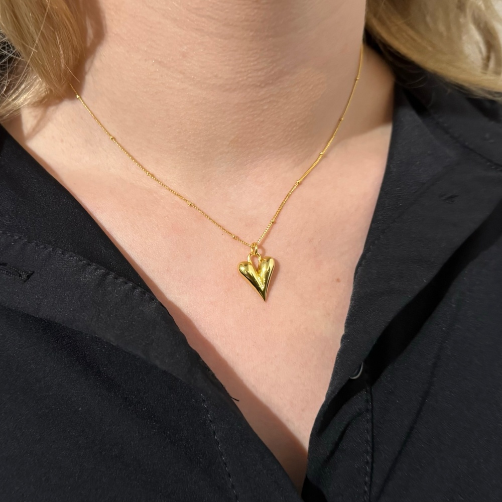 Modern design hart ketting. Een bolletjes gourmet ketting, of satteliet schakel ketting, met daaraan een lang gerekt hart. Zoek je net even dat andere design hartje, dit is de ketting voor jou.