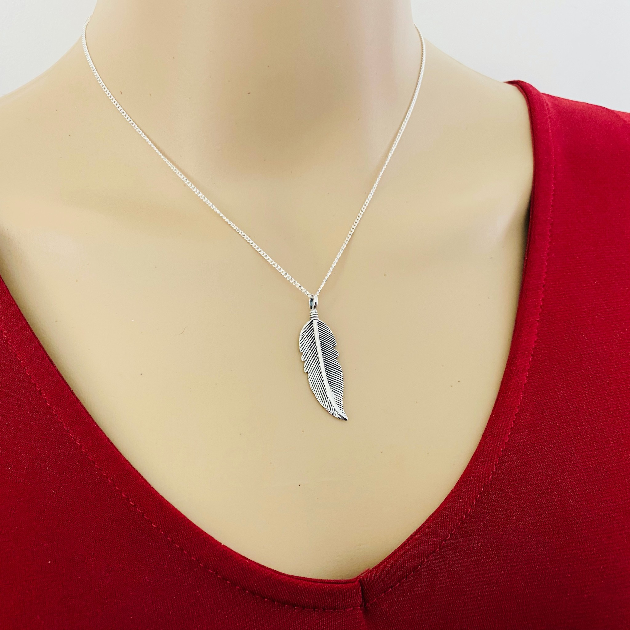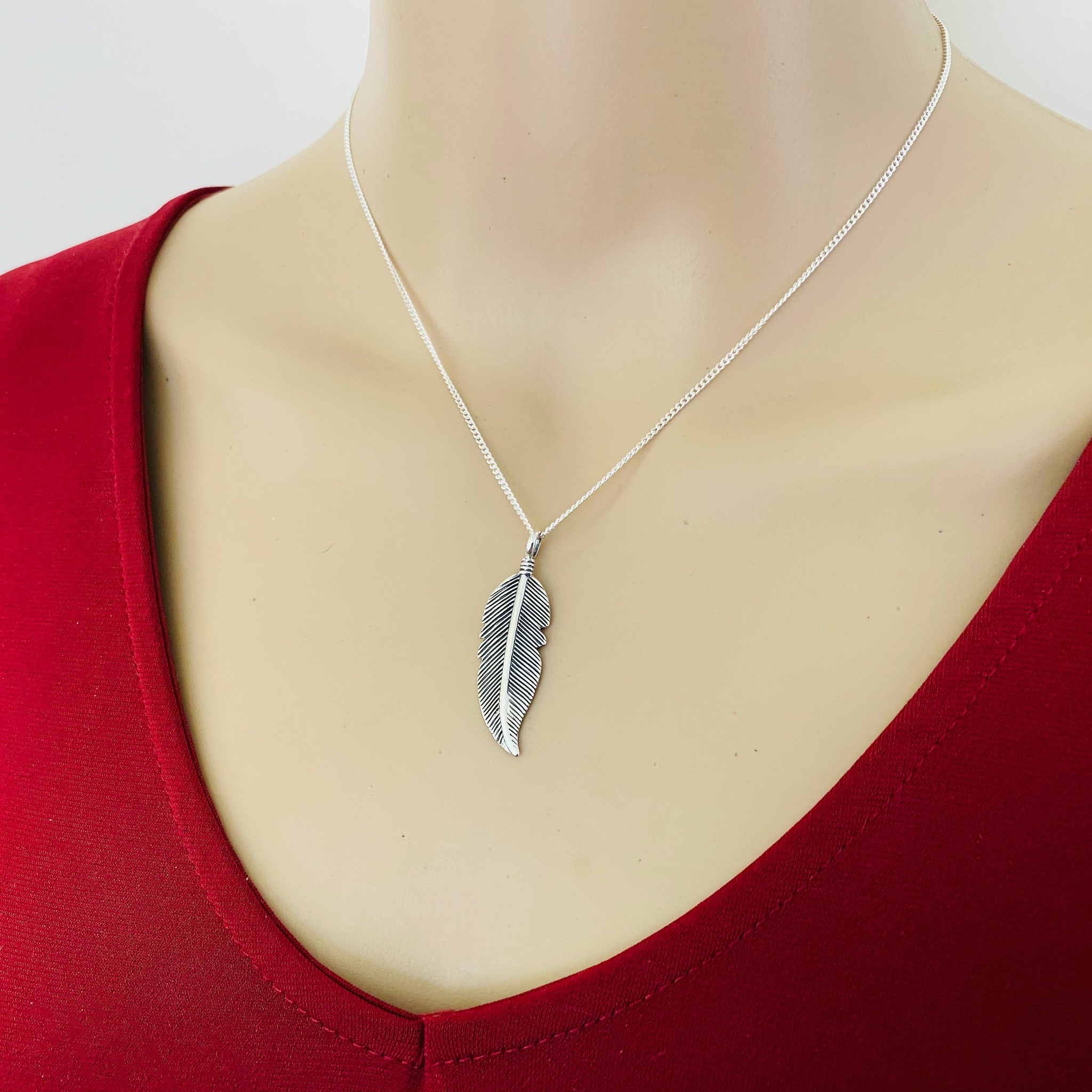 Prachtige Native American inspired zilveren veer kettinghanger. De hanger is gemaakt van 925 zilver en geoxideerd (zwart gemaakt). De hanger heeft een vast oog en een totale lengte van 40 mm en is 10 mm breed