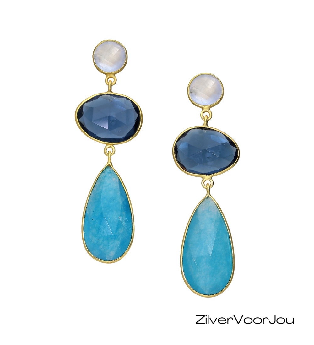 Deze stijlvolle oorbellen zijn gemaakt van 925 zilver en afgewerkt met een duurzame gold plated laag (0.3 micron). Het ontwerp is rijk gedecoreerd met drie zorgvuldig gekozen edelstenen die samen een unieke en elegante uitstraling geven: