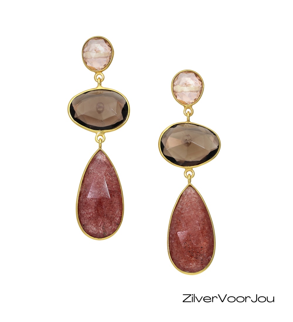 Zilveren oorbellen gold plated met morganiet, rookkwarts en strawberry kwarts