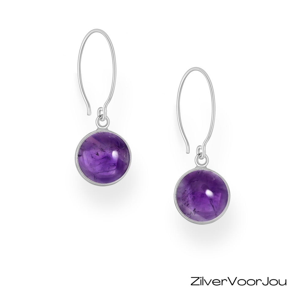 Deze elegante 925 zilveren oorbellen zijn voorzien van ronde amethist edelstenen van 13 mm. De klassieke bezelzetting benadrukt de diepe paarse kleur en laat de steen prachtig doorschijnen en uitkomen. Dankzij de slanke haakvorm hangen de oorbellen sierlijk langs het gezicht, wat ze ideaal maakt voor zowel dagelijks gebruik als speciale gelegenheden.