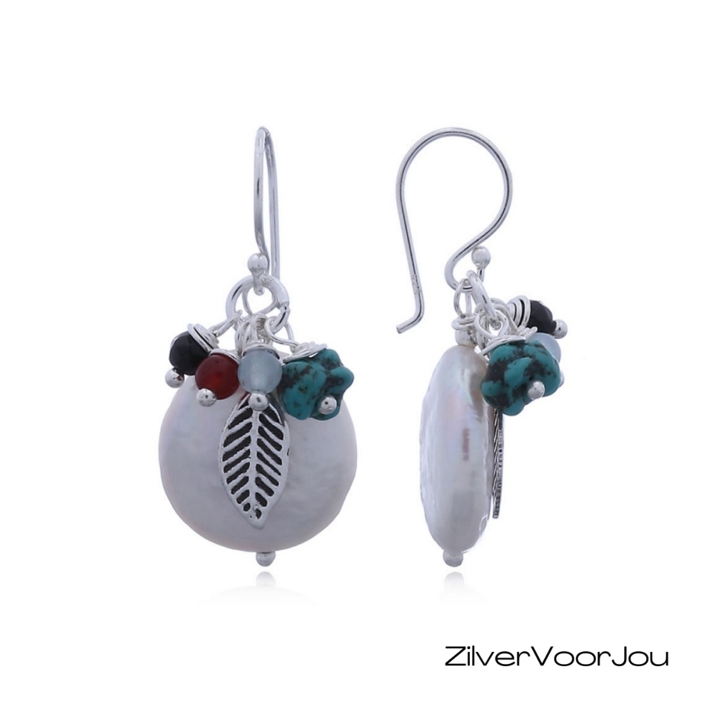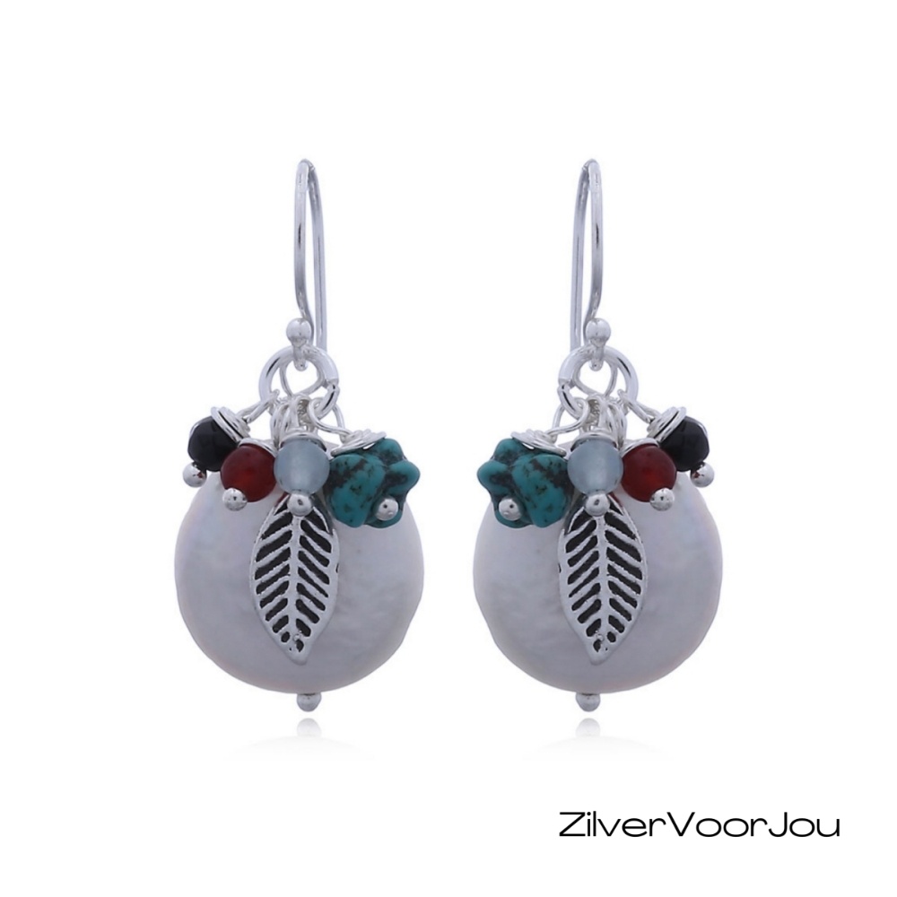 Deze oorbellen hebben zo’n speelse, bohemien uitstraling waar je meteen vrolijk van wordt. De grote, zoetwaterparel vormt het hart van het ontwerp, terwijl de kleine kraaltjes van turquoise, agaat en andere natuurlijke stenen voor kleur en karakter zorgen. Het zilveren bladbedeltje maakt het geheel nog net iets specialer.