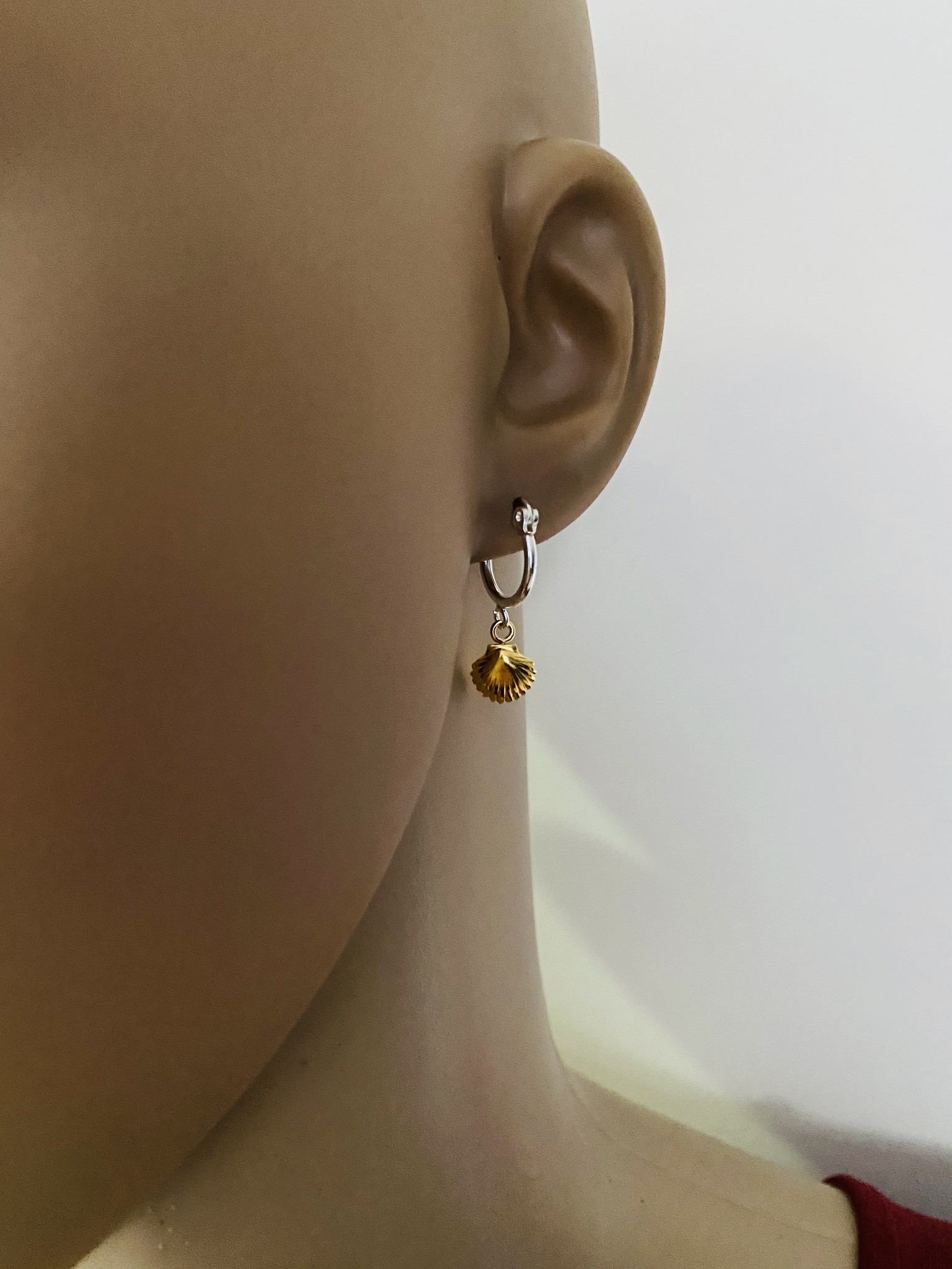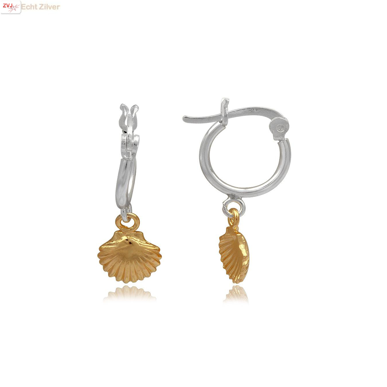 925 zilveren 12 mm oorringen met een gold plated schelp hangertje. Deze creolen hebben een makkelijke hefboom sluiting zodat je de oorringen eenvoudig in en uit kunt doen.