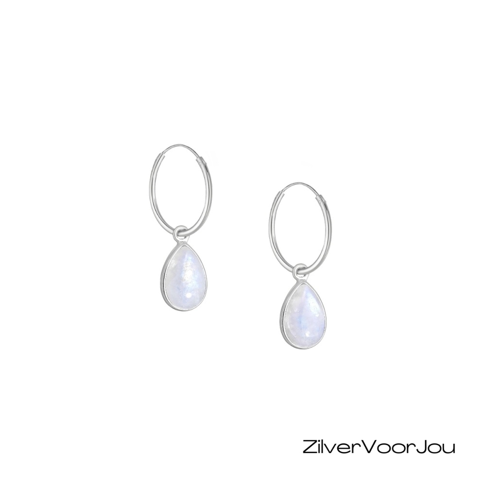 Deze kleine 925 zilveren oorringen zijn voorzien van schitterende regenboogmaansteen in druppelvorm. De bijzondere glans varieert subtiel met het licht, wat elke oorbel uniek maakt.