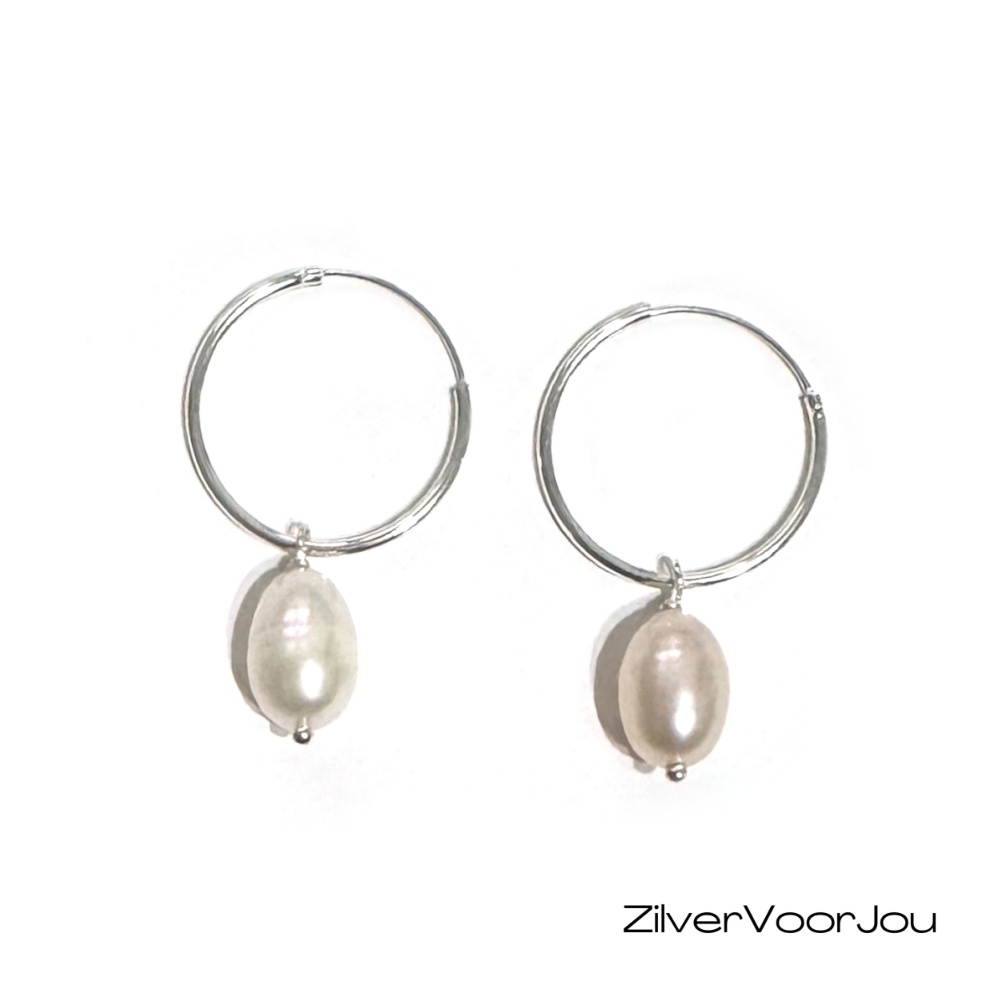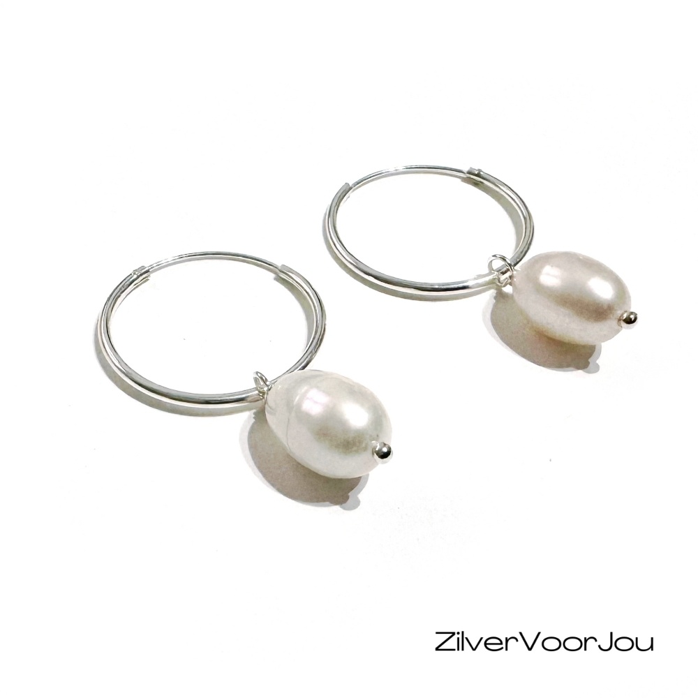 Witte zoetwaterparel oorringen. Prachtige echt 925 zilveren oorringen met een diameter van 20 mm met daaraan echte zoetwaterparels. De parels hebben een afmeting van circa 12 mm.